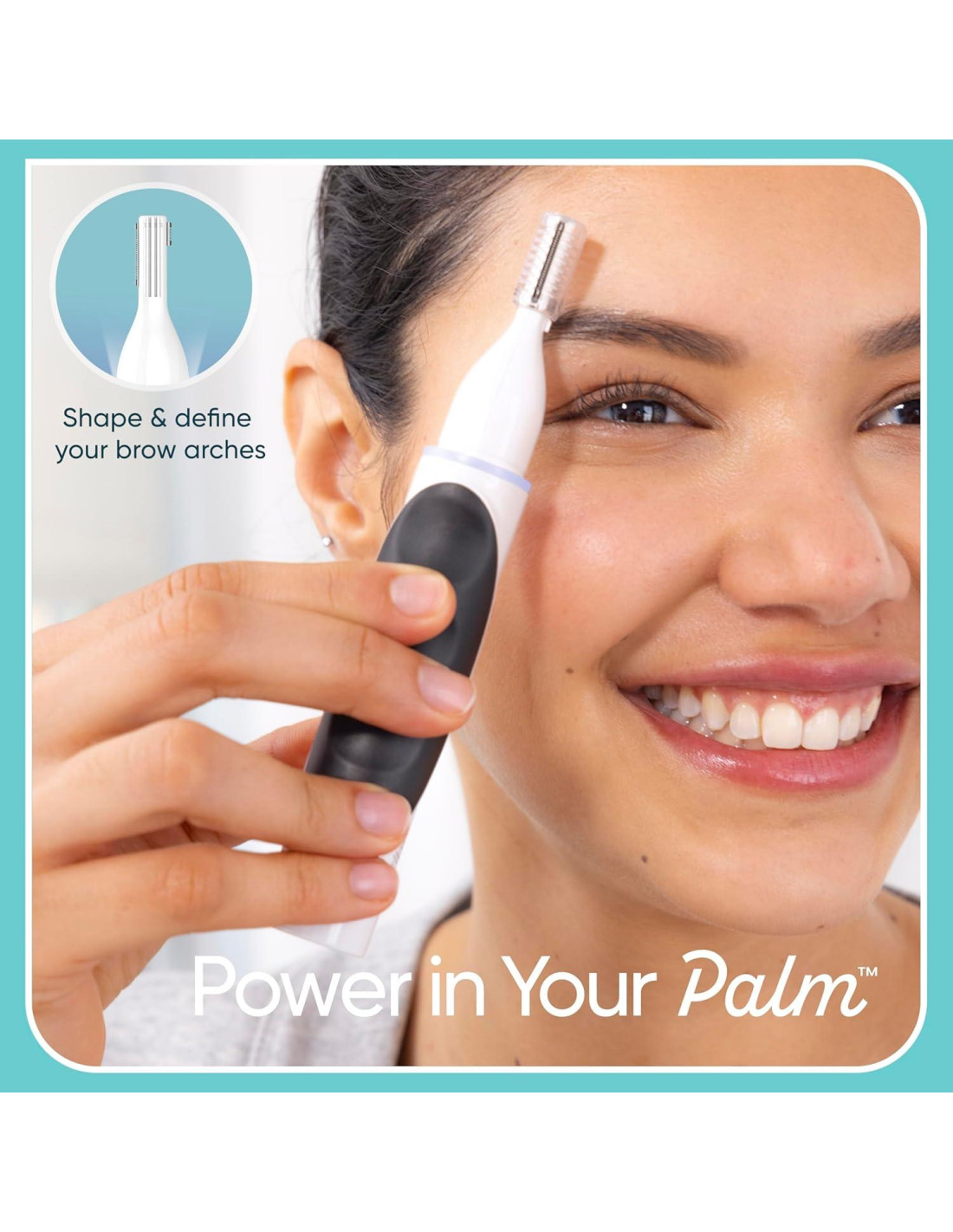 Pon el poder de recortar vello facial de manera precisa y segura en la palma de tu mano. Diseñado para la chica que va por lo suyo, espera lo mejor y lo consigue, el conjunto GIRLBOMB Face Forward de recortador de nariz, cara y cejas a batería es todo lo que necesitas para un cuidado de precisión que coincide con tu actitud. El recortador de nariz/oídos en forma de diamante con tecnología de cuchilla de 3 biseles elimina suavemente y a fondo el molesto vello de la nariz y los oídos, y el recortador facial y de cejas de doble cuchilla es ideal para eliminar el vello facial no deseado y definir tus arcos de cejas. El peine guía añade un toque preciso que facilita obtener tus cejas justo como las quieres. Este esencial de cuidado versátil tiene una luz incorporada para la iluminación LED Halo que facilita enfocarse incluso en los vellos más finos. Tú tienes el control porque el agarre ergonómico Girlbomb se adapta perfectamente a tu palma para un manejo fácil. Toma el control de tu rutina diaria de cuidado y despídete del vello no deseado. Tu estilo, tu apariencia, tu recortador todo en uno de nariz, cara y cejas, cortesía de GIRLBOMB!