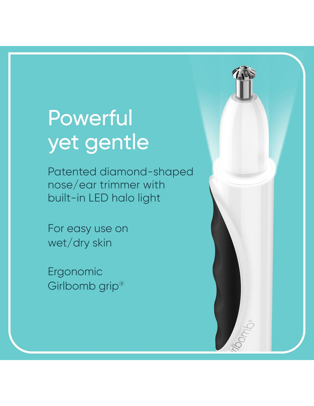 - Recortador de Nariz para Mujeres: Sin tirones, cortes ni rasguños, garantizado. Nuestra tecnología de cuchilla biselada de 360 grados en forma de diamante pendiente de patente elimina suavemente el vello no deseado. La luz halo LED incorporada ilumina incluso el vello más fino.
