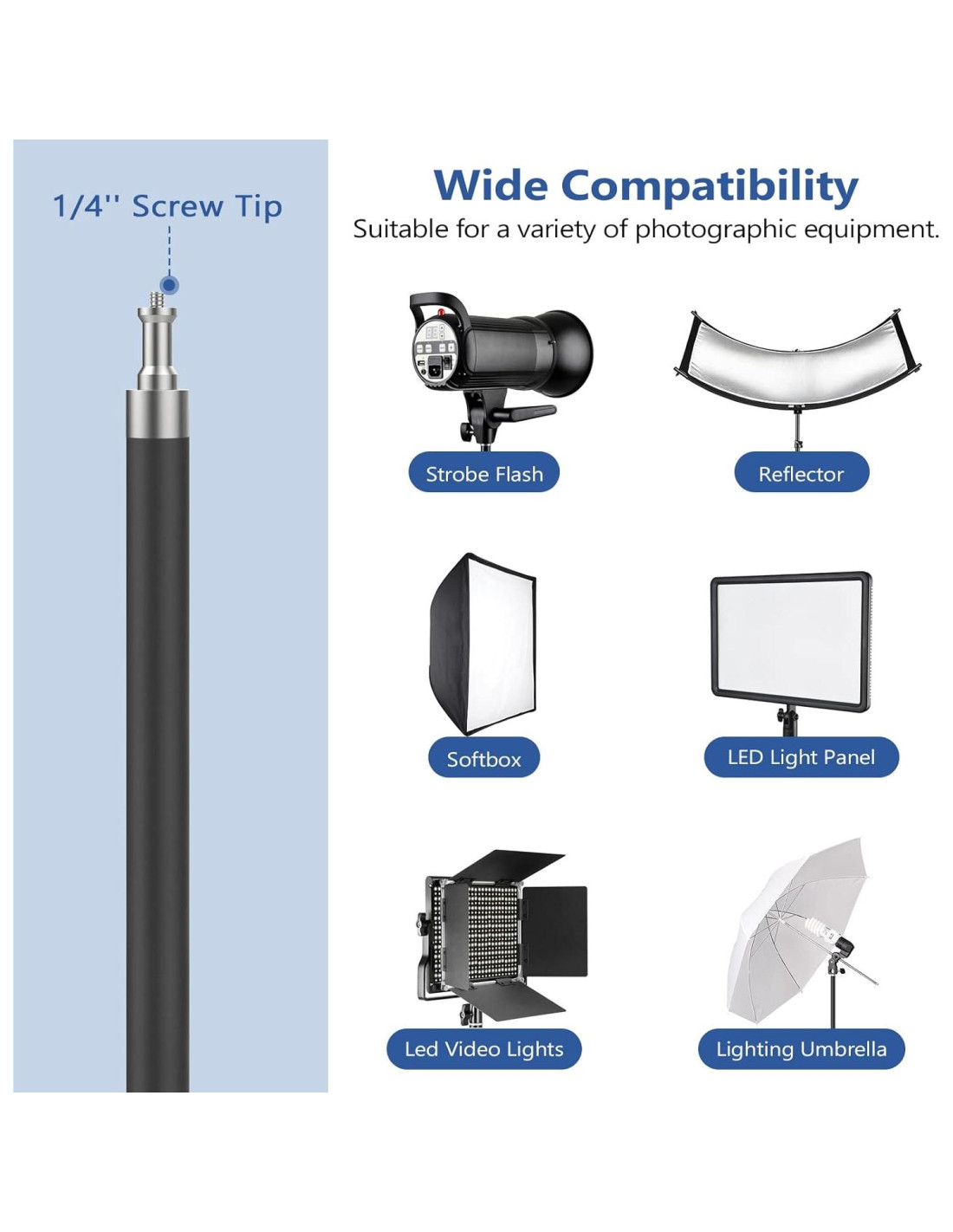 - Tops roscados de 1/4 pulgadas que soportan equipo fotográfico de alta resistencia como estabilizadores de gimbal, softboxes, paraguas, estrobos, monolights, reflectores, flashes, cámaras, etc. Adecuado para deportes profesionales, grabación de partidos de baloncesto y fútbol/estudio/oficina en casa/escena de boda/transmisión en vivo/filme en locación y más.