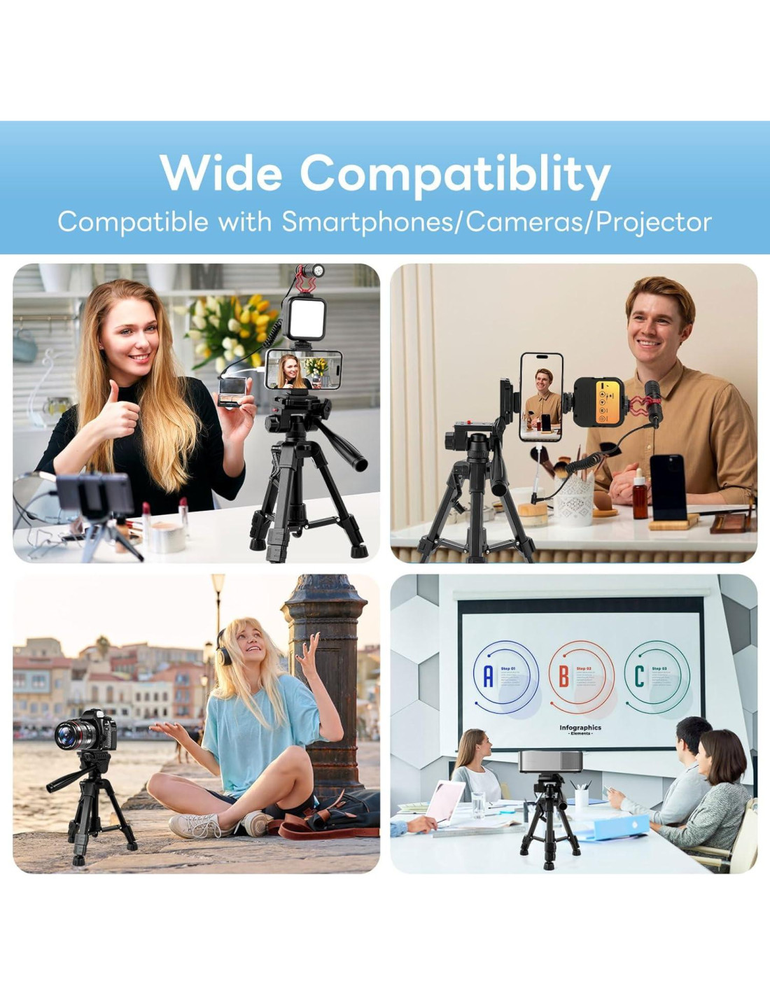 - Amplia Compatibilidad: El trípode con montura de tornillo estándar de 1/4 de pulgada es compatible con todas las cámaras (Nikon D3500, Fujifilm X-T200, Canon EOS 250D, Olympus, Panasonic), DSLR, cámaras digitales, niveles láser, proyectores, luces de anillo. Soporte para teléfono para iPhone 16 15 14 13 13 12 11/11 Pro/Pro Max/XS/XR/X/8/8 Plus/Galaxy Note 20/10/9/S23/S22/S20/S10.