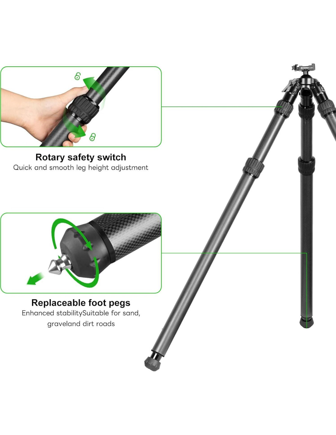 - Trípode Ajustable: sistema de bloqueo por flip, bloquear y soltar es más conveniente y rápido. Las patas del trípode se pueden ajustar independientemente para satisfacer múltiples posiciones de tiro desde sentado, arrodillado y de pie.
