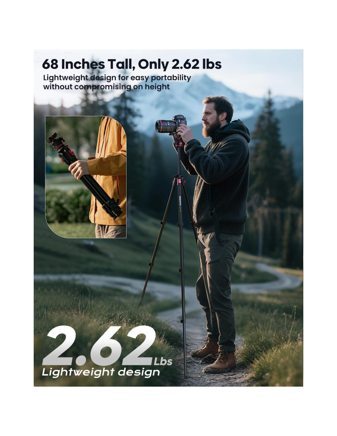 - [VERSÁTIL Y SUFICIENTEMENTE ALTO, ALTA CAPACIDAD DE PESO] Este trípode se extiende hasta 68 pulgadas (172.72 cm) para tomas más altas, con una altura mínima de 18.5 pulgadas (46.99 cm). La columna central se puede invertir, permitiendo la fotografía macro a nivel del suelo con tu cámara, perfecta para tomas de cerca. A pesar de su diseño compacto, soporta hasta 3.98 kg, lo que lo hace ideal para cámaras DSLR y SLR, telescopios, niveles láser horizontales, proyectores u otro equipo que requiera estabilidad.