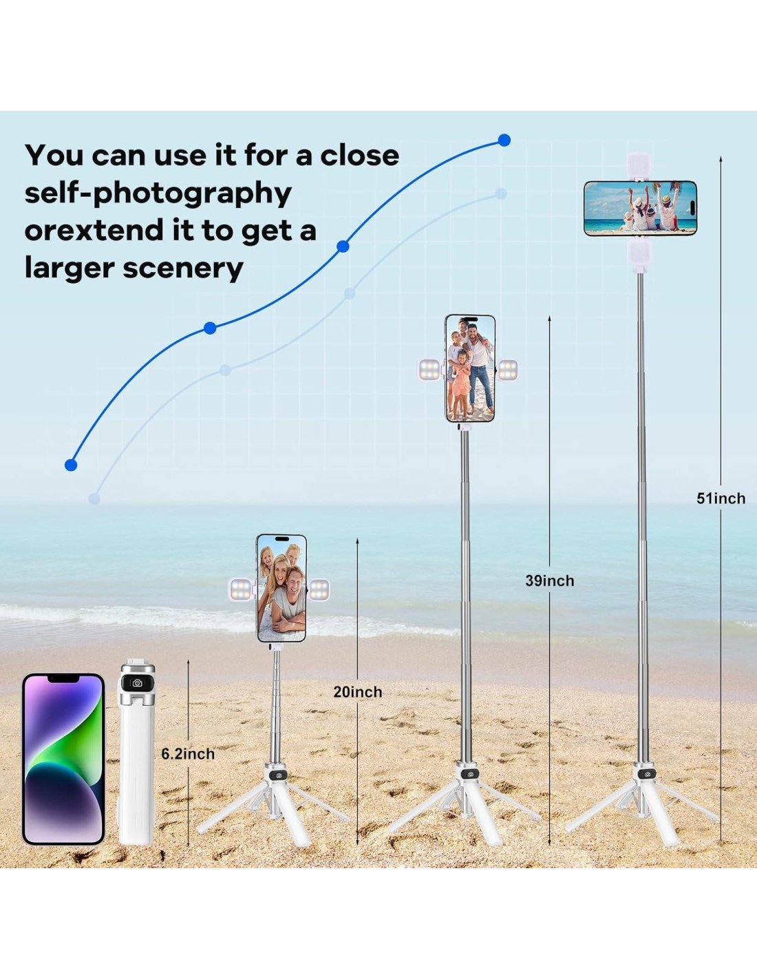 - Luz de Relleno Desmontable: El soporte de selfie y trípode tiene 3 modos de iluminación de color (9 niveles de brillo): blanco frío, blanco y blanco cálido. La iluminación ajustable hace que las fotos o videos sean más naturales y suaves. Aparte de ser un soporte de luz, también es una herramienta profesional para artistas de maquillaje, esteticistas, creadores de contenido de YouTube, blogueros de video, amantes de selfies, Facebook Live, Instagram Live, Snap chat, Fotografía de Retrato y Streaming, etc. Genial para diferentes escenas.