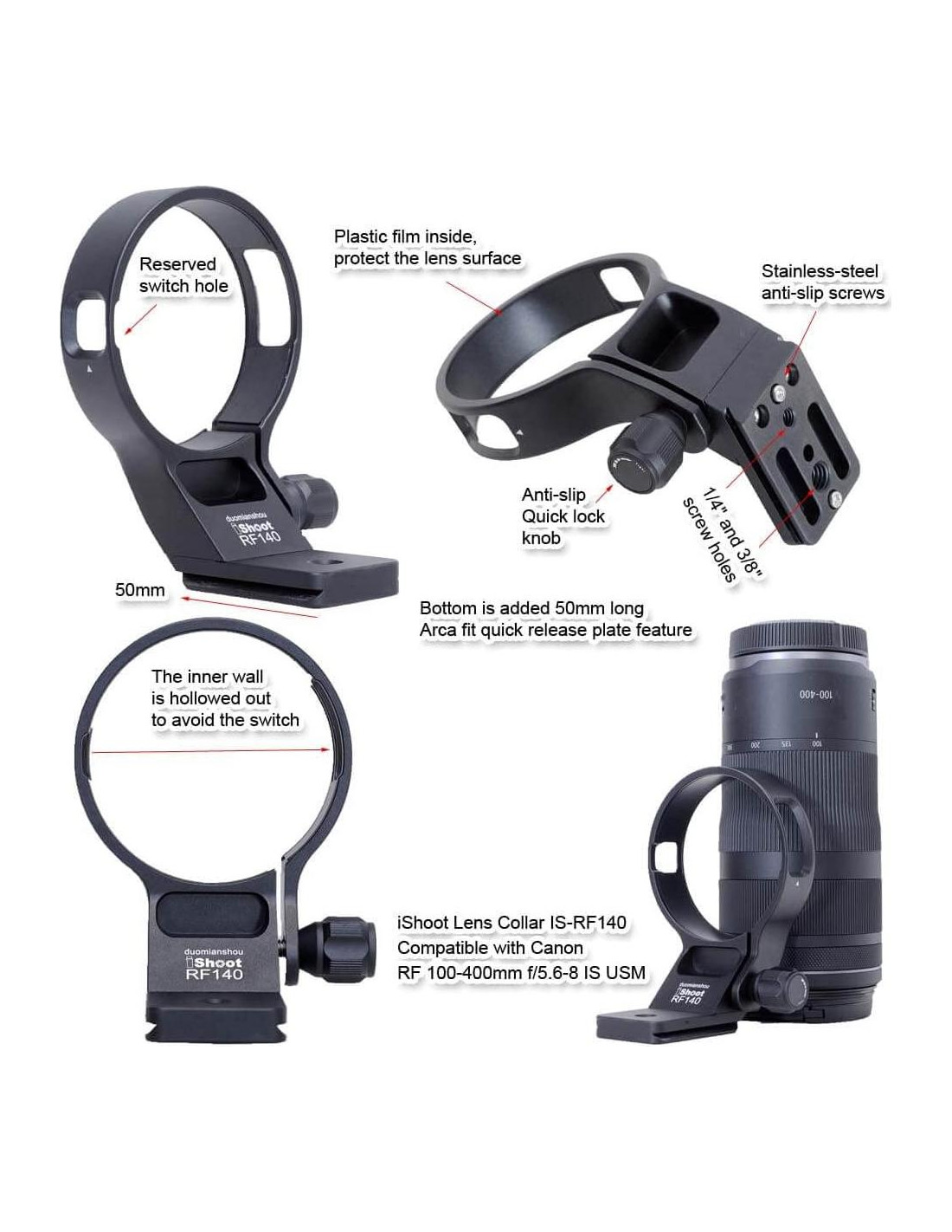 Anillo de Montaje en Trípode iShoot IS-RF140, Compatible con Canon RF 100-400mm f/5.6-8 IS USM. La base es de 39mm con Placa de Liberación Rápida Arca Fit. Características Principales: 1. El collar de lente está hecho a medida según la forma y estructura del lente, solo compatible con el lente Canon RF 100-400mm f/5.6-8 IS USM, no se puede usar con otros lentes; la pared interior del anillo de trípode tiene una estructura irregular cóncava-convexa, y se reserva un orificio para el interruptor, lo que no afecta el uso del interruptor en el lente; el anillo de trípode no puede rotar, solo soporta disparo horizontal; 2. La superficie de contacto entre la pared interior del anillo de trípode y el lente es una película compuesta de plástico, no desgastará la superficie del lente cuando se instale correctamente; no debe haber pegatinas en la posición de instalación de la superficie del lente, si las hay, retírelas, de lo contrario afectará la instalación normal; diseño de reducción de peso con huecos, el peso neto es de aproximadamente 160g; 3. La base del collar de trípode tiene una placa de liberación rápida Arca de 50mm de largo, se puede usar con cabezales de bola Arca-swiss de 39mm, cabezales panorámicos y abrazaderas directamente; más práctico que los collares de lente sin QR-Plate; también se reservan orificios para tornillos de 1/4" y 3/8" y tornillos antideslizantes de acero inoxidable para fijar el lente al trípode directamente. Compatible con: Lente Canon RF 100-400mm f/5.6-8 IS USM. No se puede usar para otros lentes. El paquete incluye: 1 x Anillo de Montaje en Trípode iShoot IS-RF140 Compatible con Lente Canon RF 100-400mm f/5.6-8 IS USM (Nota: Los otros elementos en las fotos no listados aquí son solo para ilustrar, no están incluidos)