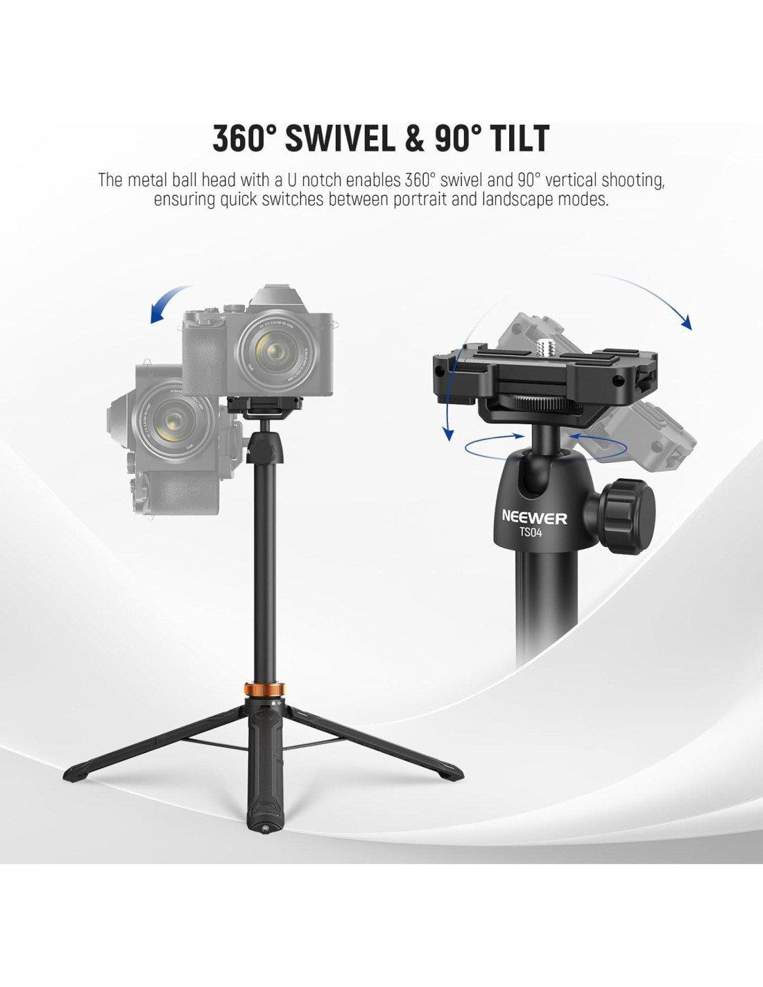 - [Rotación de 360 y Inclinación de 90] Cuenta con una cabeza de bola metálica con un diseño de muesca en U para rotación de 360 y disparo vertical de 90 de manera flexible pero estable, y asegura un cambio rápido y fácil entre modos de retrato y paisaje. La perilla de bloqueo en el lado sujeta tu dispositivo con solo un giro
