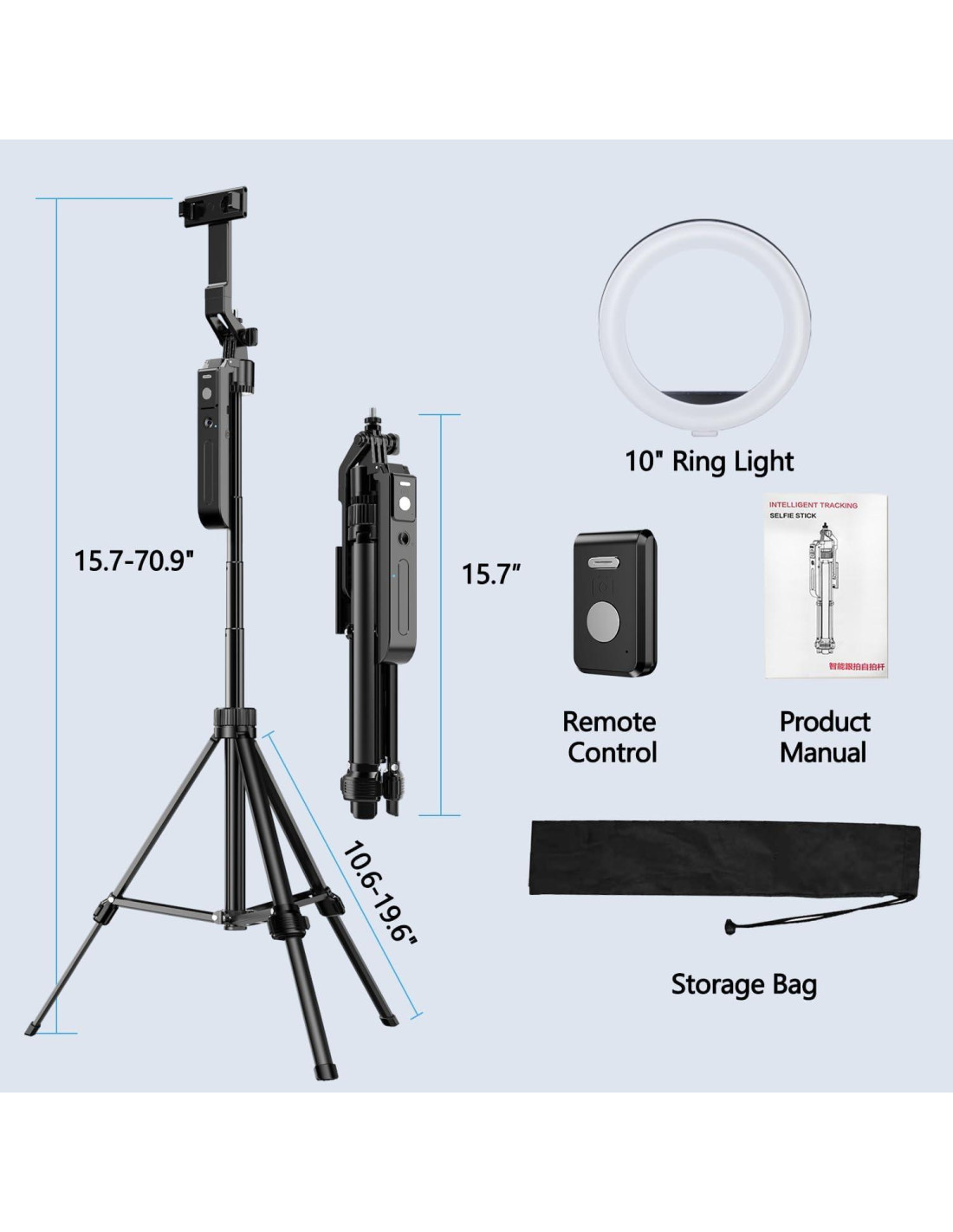 - Trípode de seguimiento de movimiento con luz anular de 10" Este trípode de seguimiento de movimiento viene con luces anulares desmontables de 10" que puedes elegir instalar para mejorar la calidad de tus videos cuando no hay suficiente luz para grabarlos. Las luces anulares tienen 3 modos de color (cálido, frío y natural) y cada modo tiene 10 niveles de brillo.