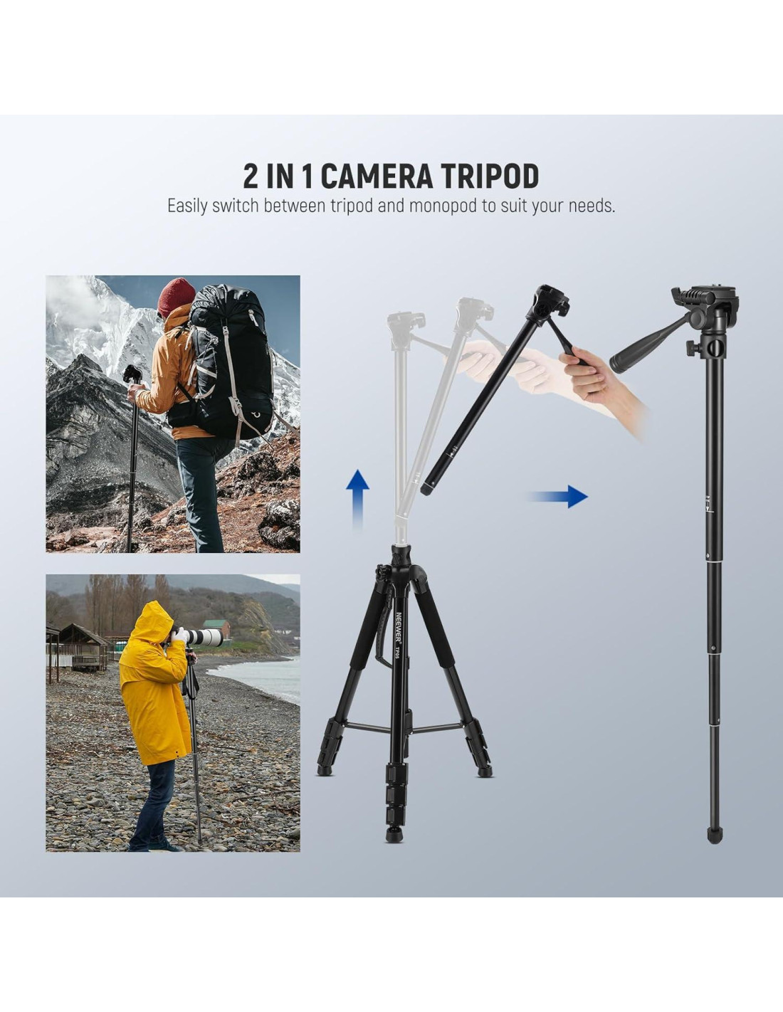 - Eje Central de Montaje Horizontal. Para más posibilidades creativas, puedes montar horizontalmente la columna central al cabezal de pan tilt de 3 vías para tomas en altura. O desmontar directamente el eje central para usar el trípode como monopod. Además, las patas del trípode de 4 secciones ofrecen un rango de altura ajustable de 23.6" (60cm) a 74.4" (189cm).