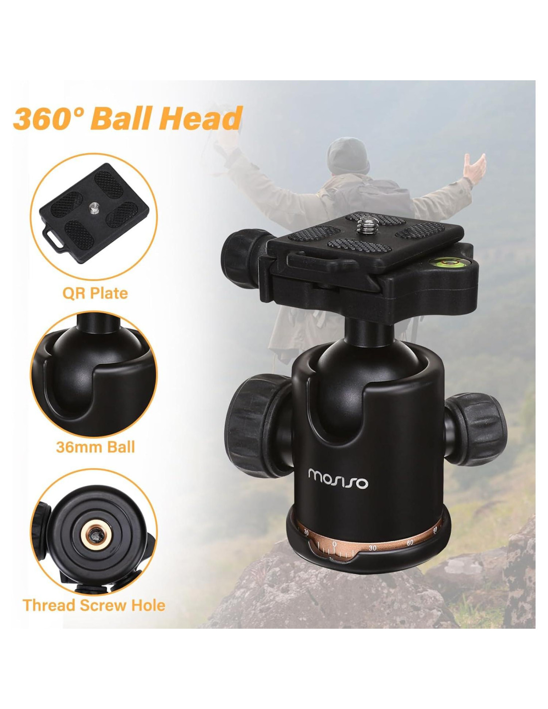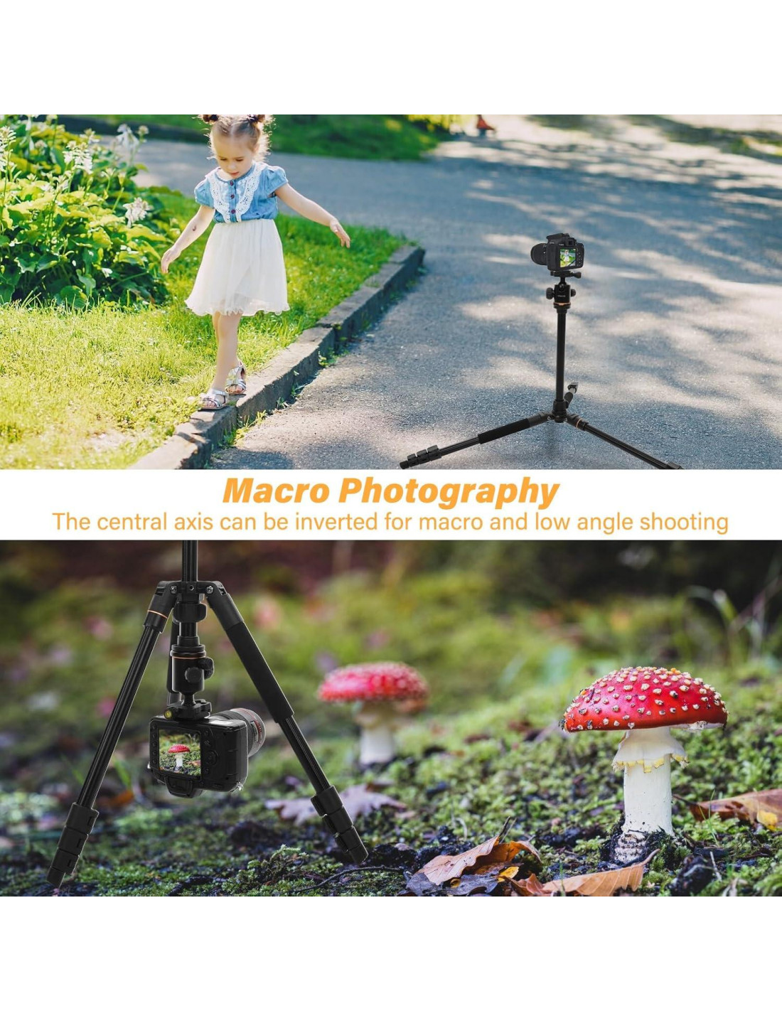 - Trípode de Cámara con Cabezal de Bola Panorama de 360 Grados. El cabezal de bola de metal de 36 mm se puede girar a cualquier ángulo para proporcionar ángulos de disparo flexibles. Diseño de columna central retráctil invertida para disparos en ángulo bajo, disparos macro y fotografía especial.