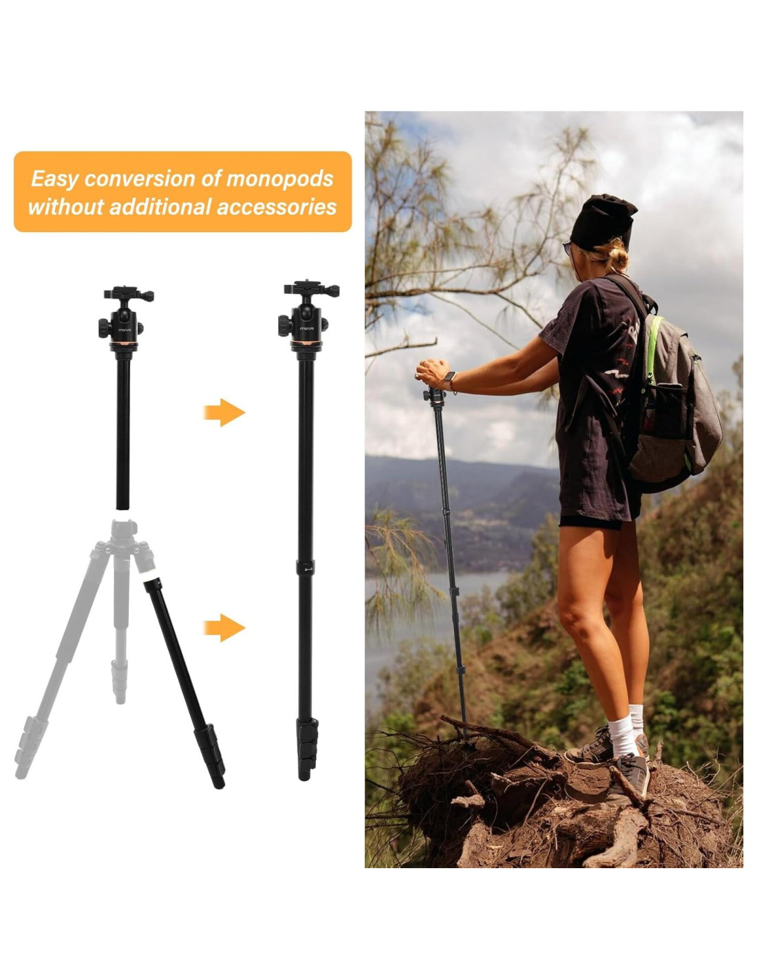 - Se Puede Convertir en Monopie. El ángulo del trípode se puede ajustar libremente según las condiciones fotográficas. La columna central y las patas de la columna se pueden desmontar, reensamblar en un monopie, o utilizarse como bastones de senderismo para satisfacer sus necesidades de fotografía al aire libre. Hay 3 niveles de burbuja en el trípode para ayudar a nivelar.