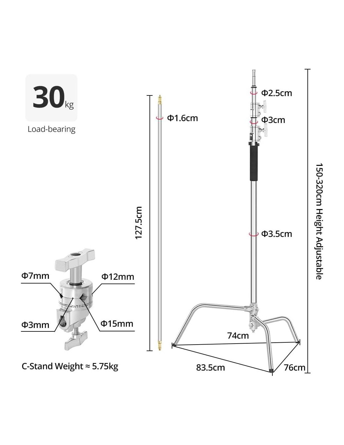 - Resistente y Versátil: Construido de acero inoxidable sólido al 100%, el C-stand proporciona durabilidad a largo plazo para soportar equipos fotográficos pesados como paraguas, flash, monoluz, reflector, softbox y más.