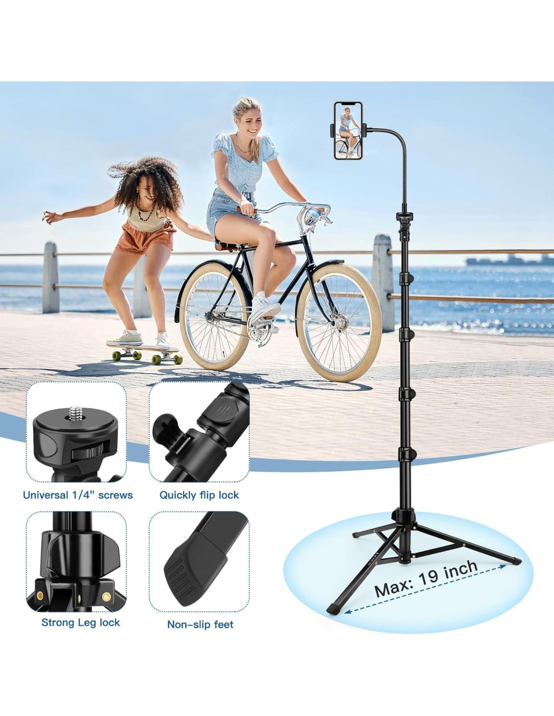 - Trípode para teléfono con cuello de ganso: Con bloqueo de flip de pierna de 4 secciones, el soporte de trípode para teléfono alto se puede ajustar de 21 a 85 pulgadas (53,34 a 215,9 cm). El trípode alto para teléfono viene con un cuello de ganso flexible de 13.78 pulgadas (35 cm), lo que te permite tomar fotos y videos desde cualquier ángulo, especialmente útil para tomas de larga distancia, ángulo bajo o ángulo alto. Está diseñado para seguir el ritmo de tus momentos