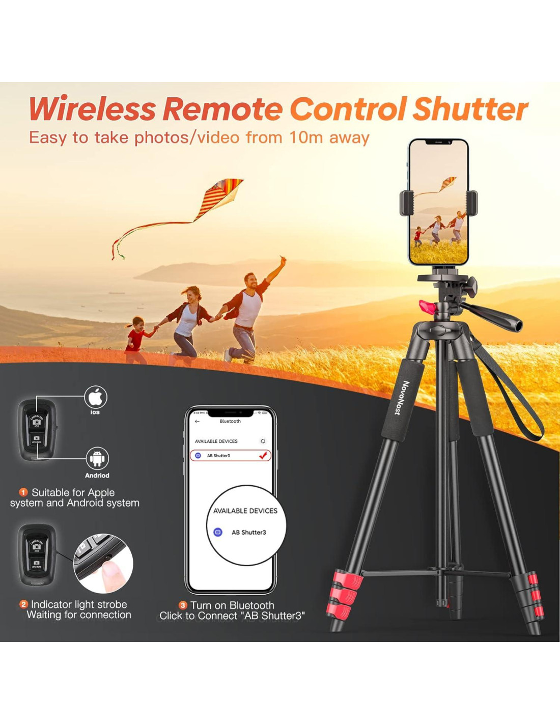 - [Control remoto inalámbrico] Nuestro trípode para iPhone incluye un obturador bluetooth que te ayuda a tomar selfies o fotos grupales desde hasta 10 m (33 ft) de distancia. Es fácil de usar y funciona sin problemas con teléfonos iOS y Android sin necesidad de descargar ninguna aplicación. Para capturar momentos especiales con amigos y familiares.