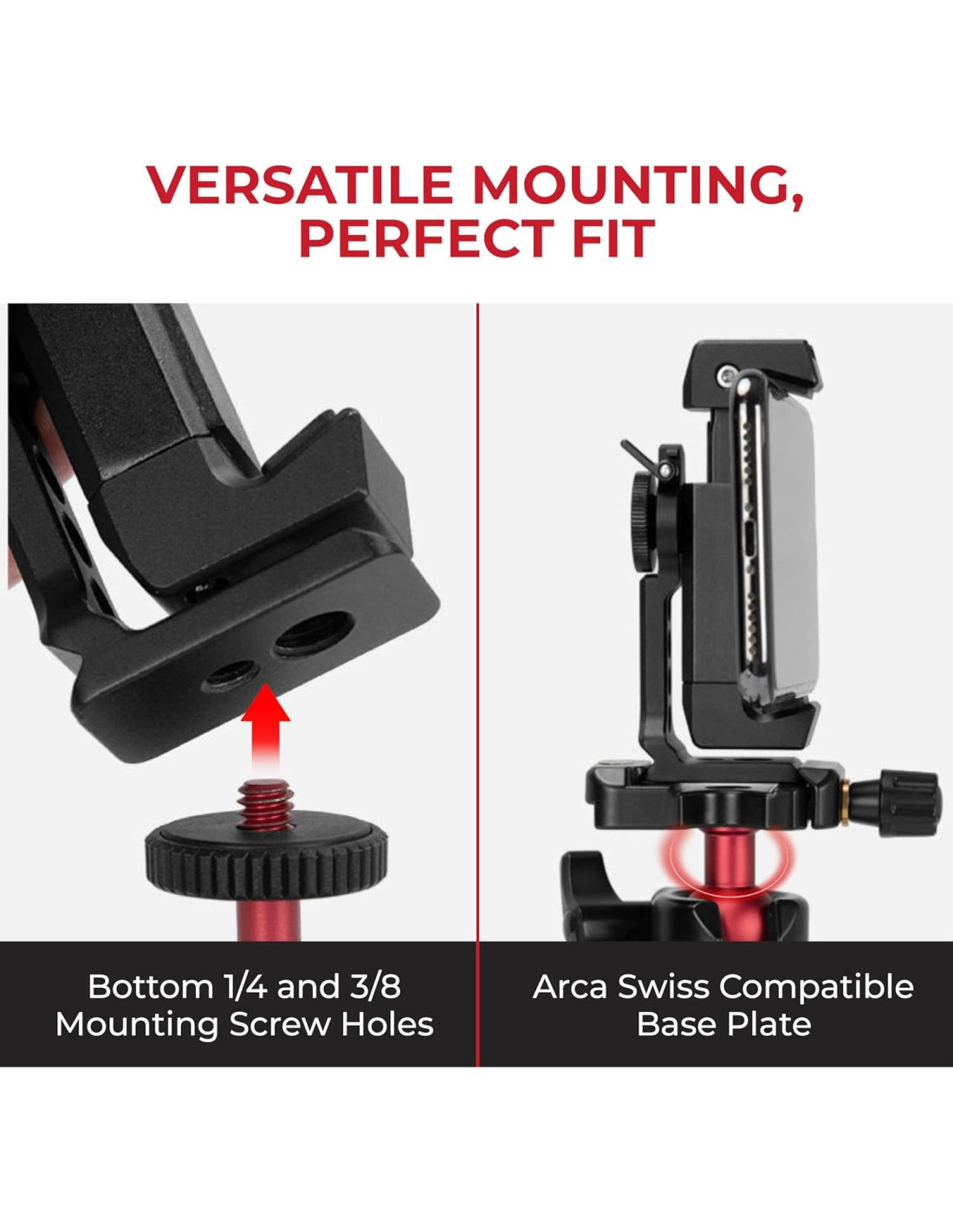 - [Compatibilidad universal con la mayoría de los trípodes:] Este soporte de teléfono se ajusta de manera segura a cualquier trípode estándar, transformándolo en un soporte de trípode para teléfono confiable para todas tus necesidades creativas.