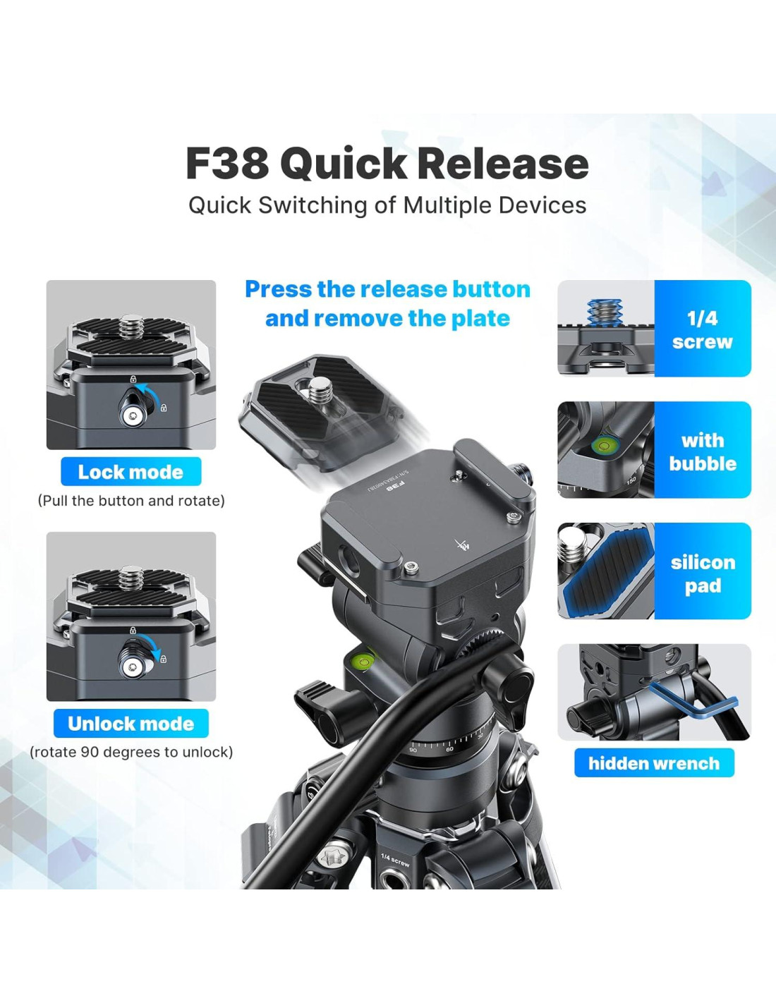 - Pan/Tilt de Cámara Suave y Flexible: Con nivel de amortiguación fijo, el cabezal de trípode de video F38 proporciona la tensión adecuada para un movimiento fluido de inclinación y panorámica de la cámara. Soporta panorámica de 360 y inclinación de -55 a 90 para realizar fácilmente fotografía en múltiples ángulos y facilitar la filmación de video suave