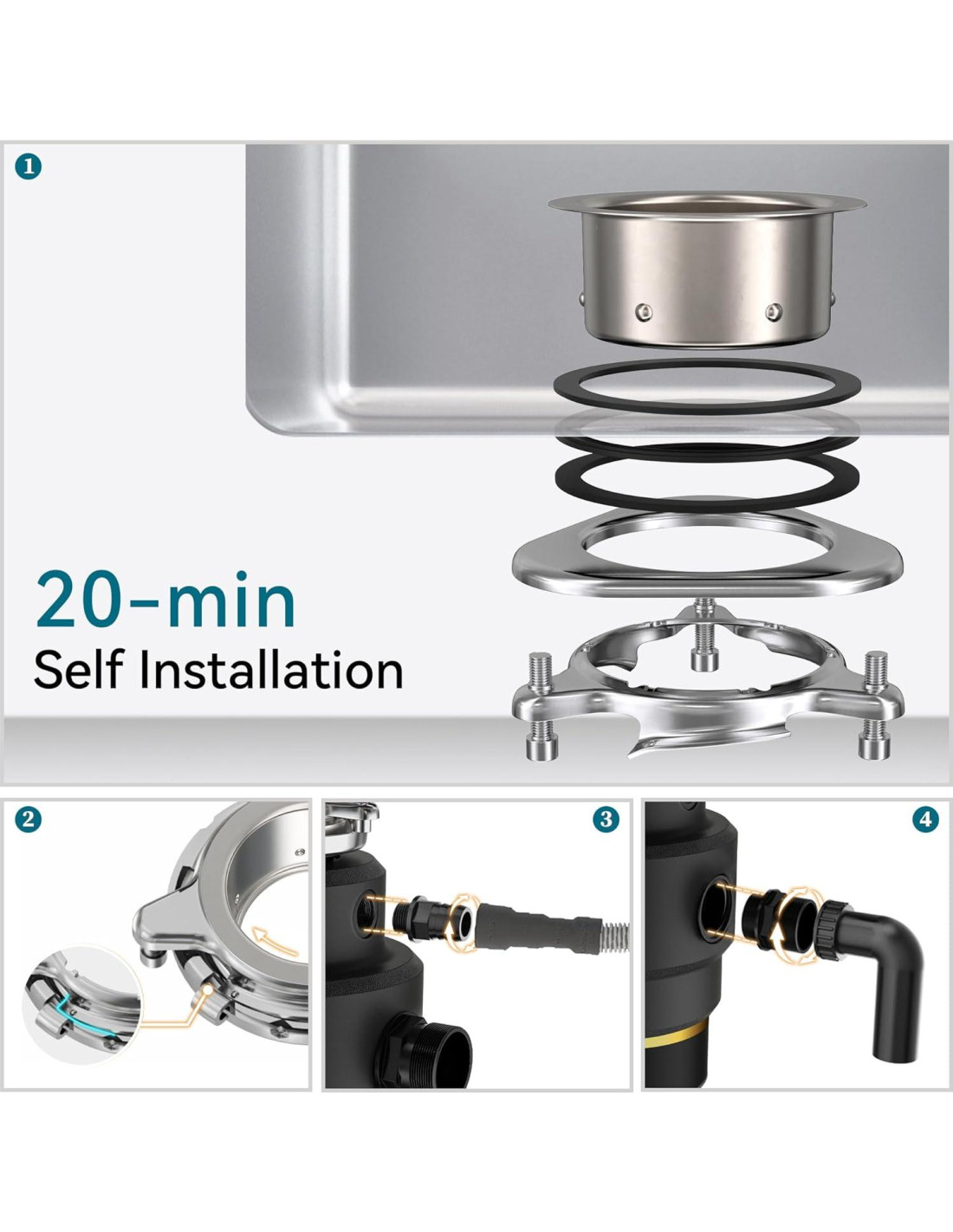 - Triturador de Basura Compacto y Silencioso - Este triturador de basura para fregadero tiene 3 dimensiones de reducción de ruido. 2 cajas de aislamiento acústico envuelven material que amortigua el sonido. Encontrarás que el trabajo de molienda es un 15% más silencioso que otros trituradores de basura de 3/4 hp. Además, el diseño de fondo estrecho de este triturador de basura corto te deja más espacio para almacenamiento debajo del fregadero. Altura máxima es 13 pulgadas (33,02 cm).