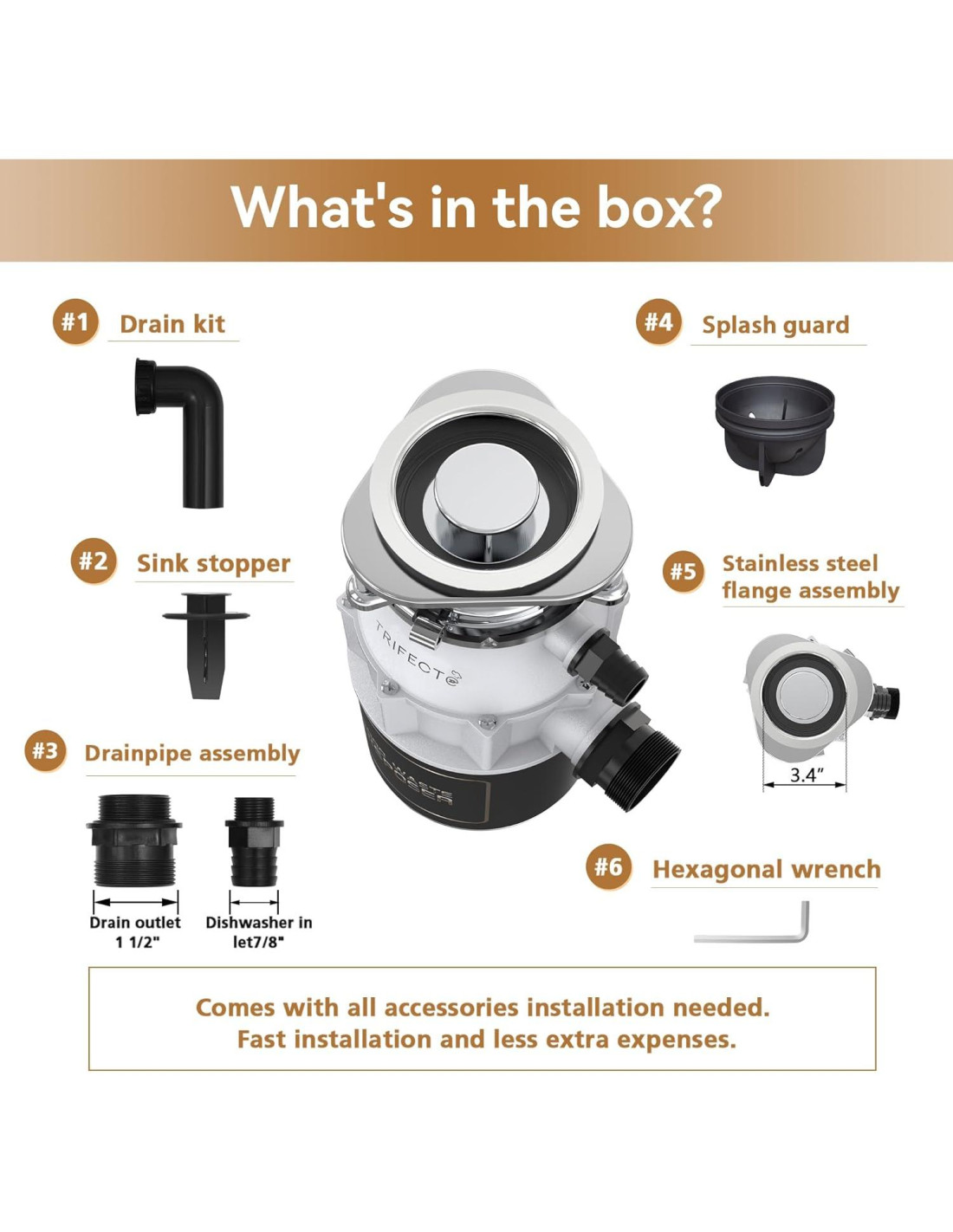 - Lista de accesorios: Triturador de desechos Trifecte de 3/4HP, ensamblaje de brida, protector contra salpicaduras removible, enchufe, tubo de drenaje, llave hexagonal, cable de alimentación. Aviso: Ensamblado con puerto para lavavajillas y cable de alimentación de 43 pulgadas (109,22 cm), este triturador de basura Wrecker es adecuado para la mayoría de las cocinas domésticas para aberturas de fregadero estándar de 3.5 pulgadas (90-110 mm), otras aberturas de fregadero necesitan ser instaladas con un reductor adicional.