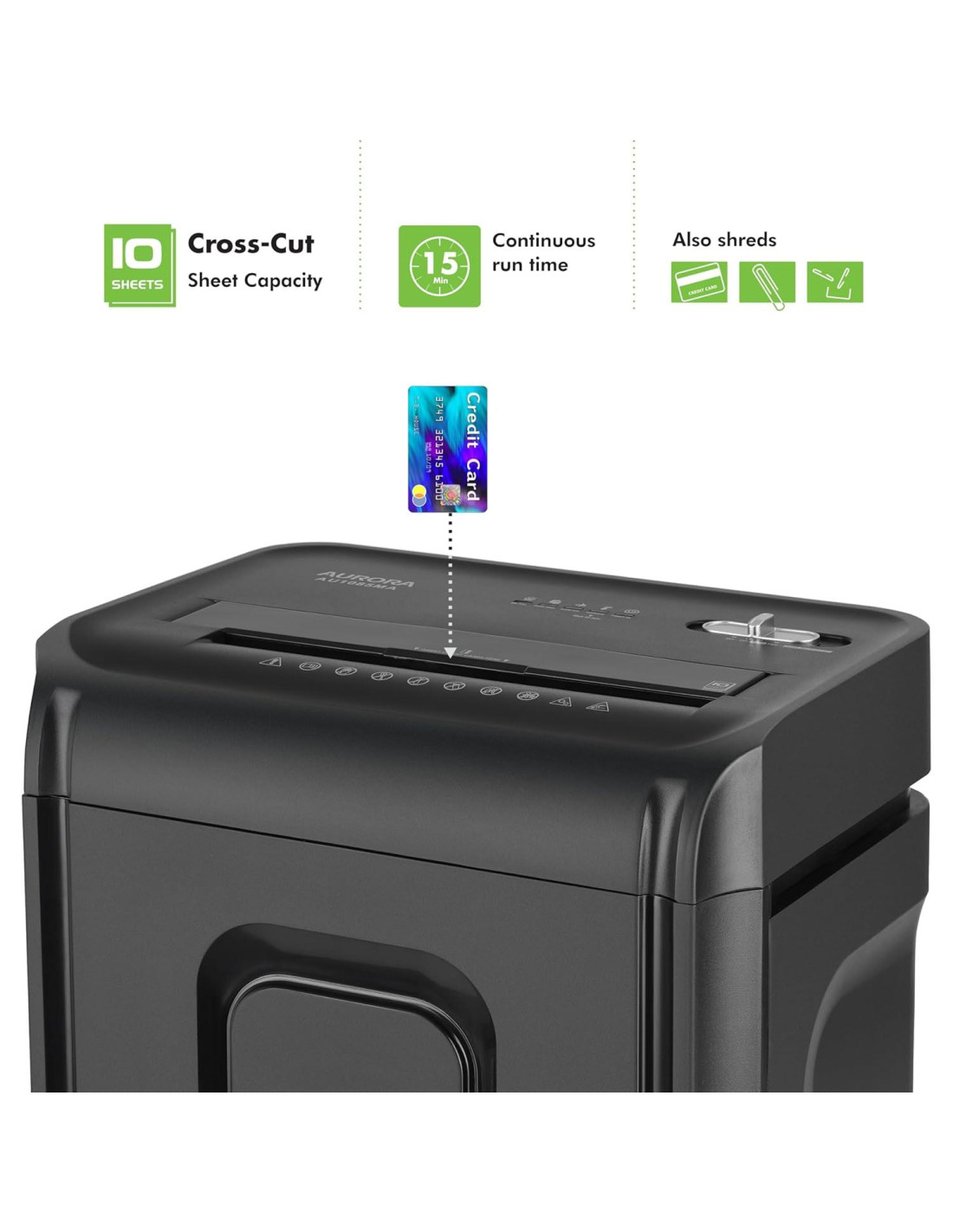 - Corte cruzado con capacidad para 10 hojas; tritura tarjetas de crédito y clips de papel pequeños.