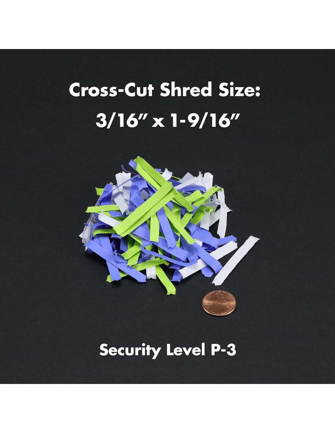 - Tritura papel y tarjetas de crédito en piezas pequeñas (4.76 por 3.97 centímetros), nivel de seguridad P-3