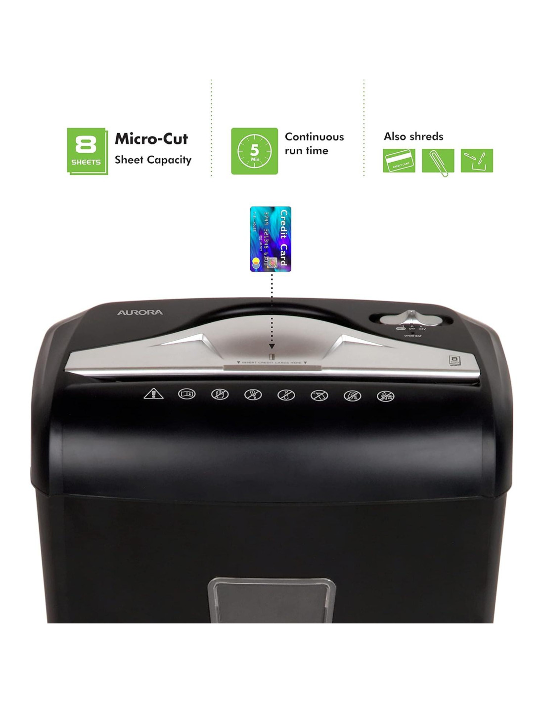La Aurora AU870MZ destructora de papel de micro corte de 8 hojas con cesta es el dispositivo perfecto para el hogar y pequeñas oficinas para ayudar a mantenerte a salvo del robo de identidad. La AU870MZ acepta hasta ocho hojas de papel a la vez y las destruye en piezas de 5/32 x 15/32 pulgadas (3.97 x 11.90 mm). Además del papel, la AU870MZ destruye tarjetas de crédito, manteniendo la información vital fuera del alcance de las manos equivocadas. La abertura de la destructora mide 8.7 pulgadas (22.10 cm) de ancho y permite un funcionamiento continuo durante 5 minutos. Dimensiones del producto: 11.81 x 7.13 x 17.44 pulgadas (30.00 x 18.10 x 44.30 cm) Peso del artículo: 11.7 libras (5.30 kg) Peso de envío: 13.5 libras (6.12 kg) Número de modelo del artículo: AU870MZ
