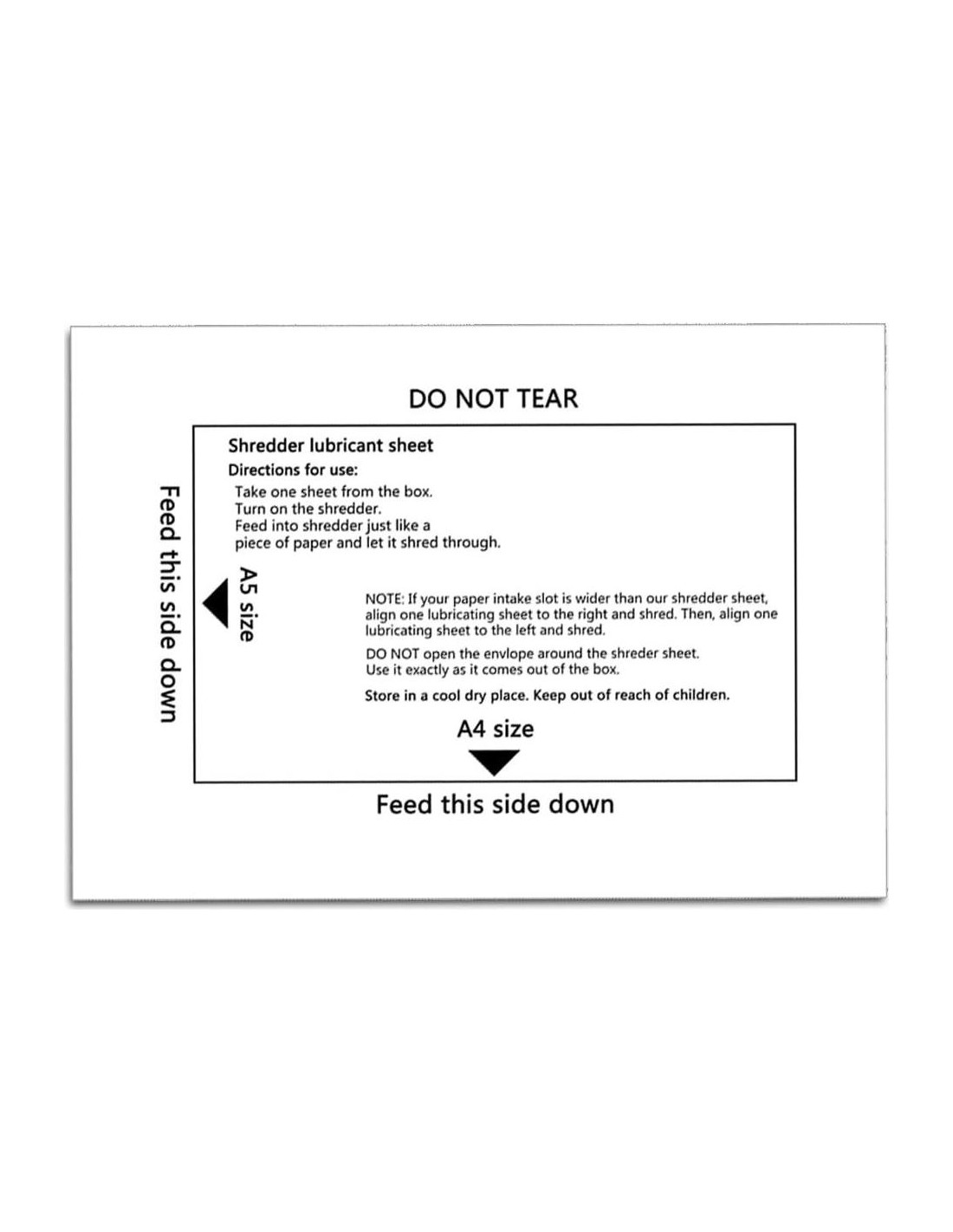 - Hojas de aceite lubricante compatibles con todas las trituradoras de papel. Tamaño de la hoja: 8.4 * 6 pulgadas (213 mm x 151 mm).