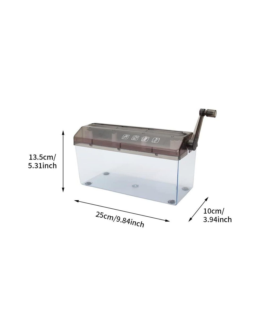 Característica: 1. Trituradora de papel manual: La trituradora de papel adopta un diseño manual, más segura para los niños. Está diseñada con una manivela, gírela para triturar papel, ahorrando tiempo y esfuerzo. 2. Mini y portátil: La trituradora mide aproximadamente 25 x 10 x 13.5cm(9.84 x 3.94 x 5.31 pulgadas)(L x A x H), mini y portátil, adecuada para uso en oficina, escuela o hogar. 3. Antideslizante: La mini trituradora está diseñada para escritorio, cuenta con almohadillas antideslizantes en la parte inferior, asegurando que la trituradora se mantenga firme al trabajar. 4. Amplia aplicación: Es adecuada para triturar facturas financieras, papel A4, facturas de cara de envío, facturas bancarias, facturas diarias, facturas de mostrador, seguridad de su privacidad e información personal. 5. Contenedor de almacenamiento transparente: El contenedor de almacenamiento triturado es transparente, lo que facilita ver cuándo está lleno, solo necesita quitar suavemente la tapa para vaciar. Especificaciones: Color: Negro Material: Plástico, hoja de metal Tamaño: Aproximadamente 25 x 10 x 13.5cm(9.84 x 3.94 x 5.31 pulgadas)(L x A x H) Paquete incluye: 1pc x Mini trituradora de papel Nota: 1. Debido a la diferencia de luz y pantalla, el color del artículo puede ser ligeramente diferente al de las imágenes. 2. Por favor, permita diferencias de 0.5-2 cm debido a la medición manual.