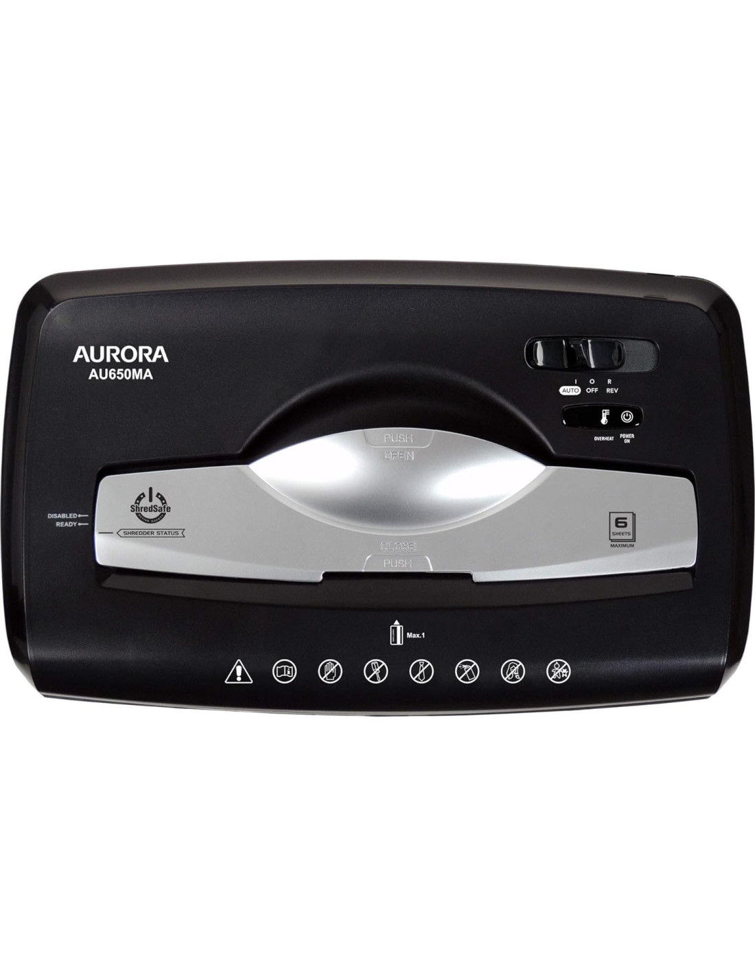 La Aurora AU650MA trituradora de papel y tarjetas de crédito de micro-corte de 6 hojas con un cesto de 3.7 galones (14 litros) es el dispositivo perfecto para el hogar y pequeñas oficinas para ayudar a mantenerte a salvo del robo de identidad. La AU650MA acepta hasta seis hojas de papel a la vez y las corta en piezas de 5/32 x 15/32 pulgadas (4 x 12 mm). Además del papel, la AU650MA destruye tarjetas de crédito, manteniendo la información vital fuera del alcance de las manos equivocadas. La abertura de la trituradora mide 8.7 pulgadas (22.1 cm) de ancho. El artículo incluye un mango integrado para facilitar el vaciado del cesto de 3.7 galones (14 litros) y una función de parada automática por sobrecarga para prevenir atascos de papel graves. Dimensiones del producto: 12.05 pulgadas (30.6 cm) de ancho x 7.32 pulgadas (18.6 cm) de largo x 14.84 pulgadas (37.7 cm) de alto.