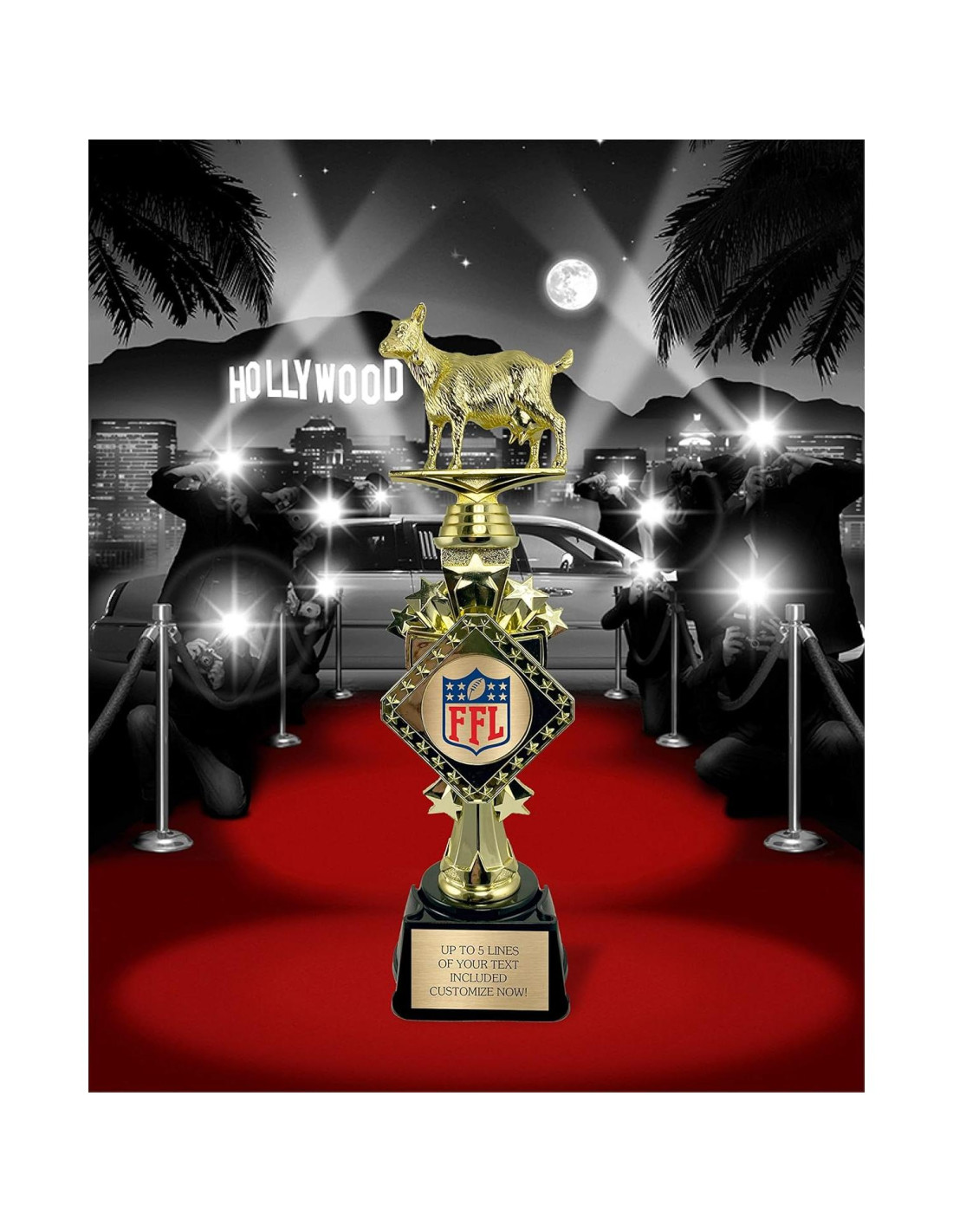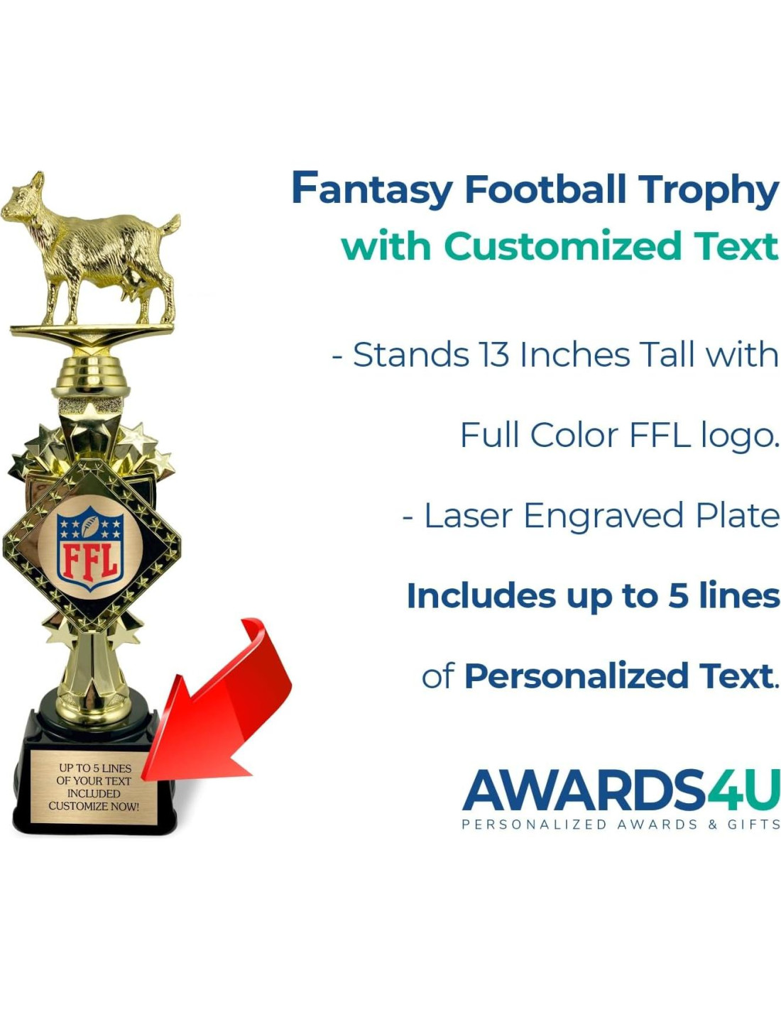 - TROFEO DE FÚTBOL FANTASÍA 2025 Personalizable - Cada trofeo personalizado incluye su texto personalizado así como un logo FFL y figura de cabra en la parte superior.