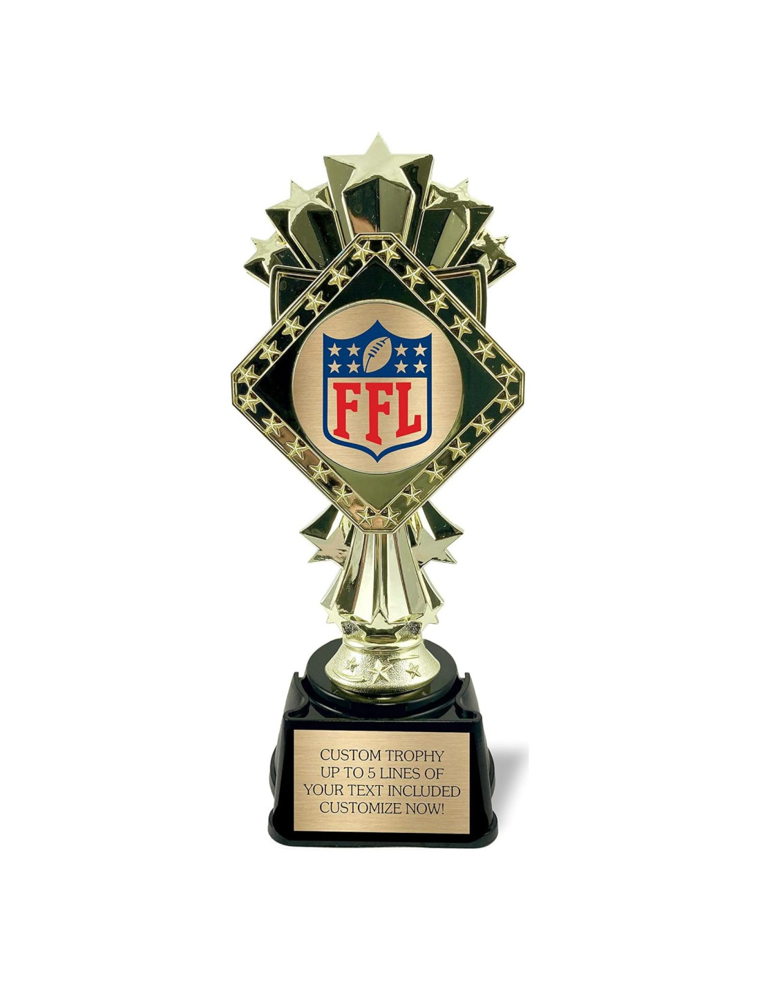 - 9 Pulgadas de Alto (22.86 cm) - Este trofeo FFL mide 9" de alto y presenta un logo impreso con el emblema de Fútbol Fantasía junto con tu mensaje personalizado en la placa dorada.