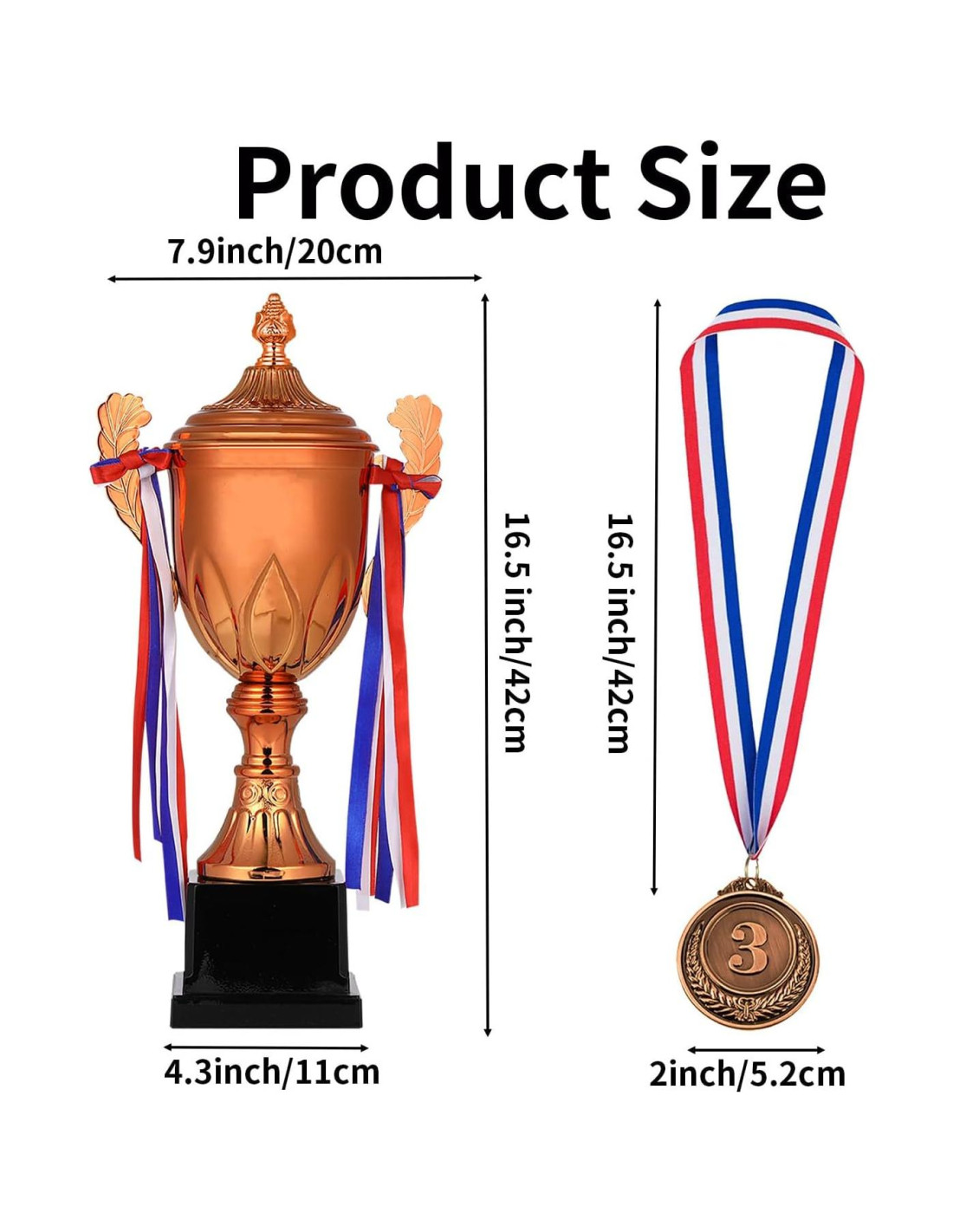 - Kit de Trofeo y Premio: Incluye un gran trofeo con dimensiones de 16.5 x 7.9 x 4.3 pulgadas (41.9 x 20.1 x 10.9 cm) y una medalla con un diámetro de 2 pulgadas (5.1 cm), acompañada de una cinta de cuello tricolor roja, blanca y azul de 16.5 pulgadas (41.9 cm) de largo.