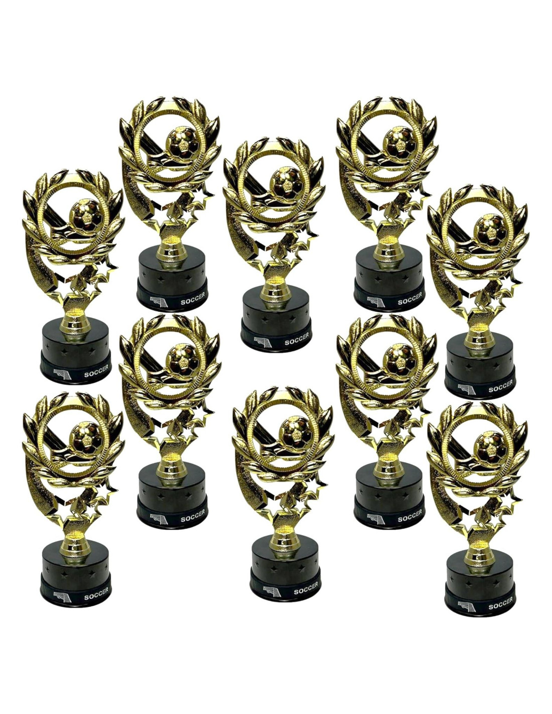 - Cada una de las 10 figuras de trofeo de fútbol presenta un diseño único de corona con zapato de fútbol y balón.