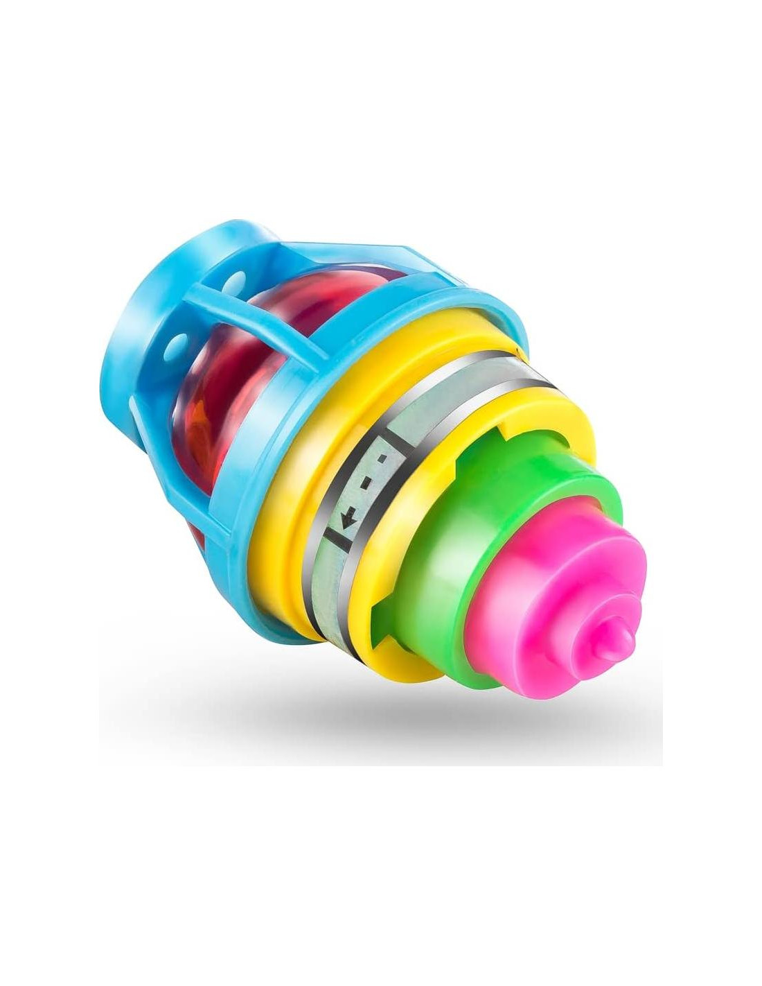 - Adjunta el giroscopio a los trompos, gira la manija 3 veces, presiona el botón y déjalo girar.