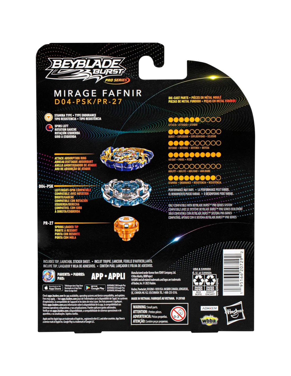 - PEONZA AUTÉNTICA INSPIRADA EN JAPÓN: La línea de la serie Beyblade Burst Pro presenta peonzas con diseño y decoración originales de Takara Tomy Superking como se venden en Japón. Incluye peonza de batalla tipo resistencia de giro a la izquierda Mirage Fafnir D04-PSK PR-27 con componentes auténticos. Viene con lanzador de giro a la izquierda y hoja de pegatinas (lanzador de giro a la derecha se vende por separado, sujeto a disponibilidad)