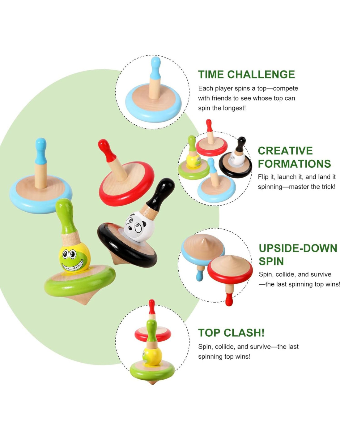- Colores Brillantes y No Tóxicos para un Juego Seguro Cada trompo de madera presenta pintura vibrante y segura para niños en amarillo, verde, rojo y azul. Los colores no tóxicos y ecológicos mejoran la estimulación visual mientras son completamente seguros para niños pequeños y niños.