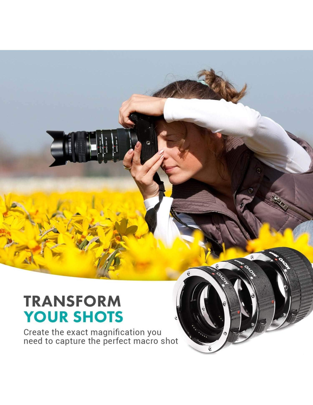 Transforma tus lentes no macro en una herramienta para fotografía macro de calidad profesional con el Juego de Tubos de Extensión Macro AF de Movo Photo. Usa los tubos de extensión - 12mm, 20mm y 36mm - individualmente o juntos para crear la magnificación exacta que necesitas para capturar la toma macro perfecta. Cuanto más largo sea el tubo, más cerca puede enfocar el lente. La fotografía macro permite tomas en primer plano extremo, ampliando el sujeto de la imagen muchas veces su tamaño real. Captura la naturaleza en su forma más vívida, realista e inmediata; fotografía insectos, plantas y flores, pequeños animales con un detalle increíble y dramático; examina texturas como nunca antes; explora nuevos límites de la fotografía. El Juego de Tubos de Extensión Macro AF de Movo Photo te brinda las herramientas para reproducir tomas de estilo profesional, tal como las ves en revistas y libros. Los tubos de extensión no contienen óptica, simplemente reducen la distancia mínima de enfoque normal sin degradar la calidad óptica original. Mantén convenientemente el autoenfoque a f/5.6 o más brillante para asegurar una gran toma. Los montajes de aluminio están diseñados para durabilidad.
