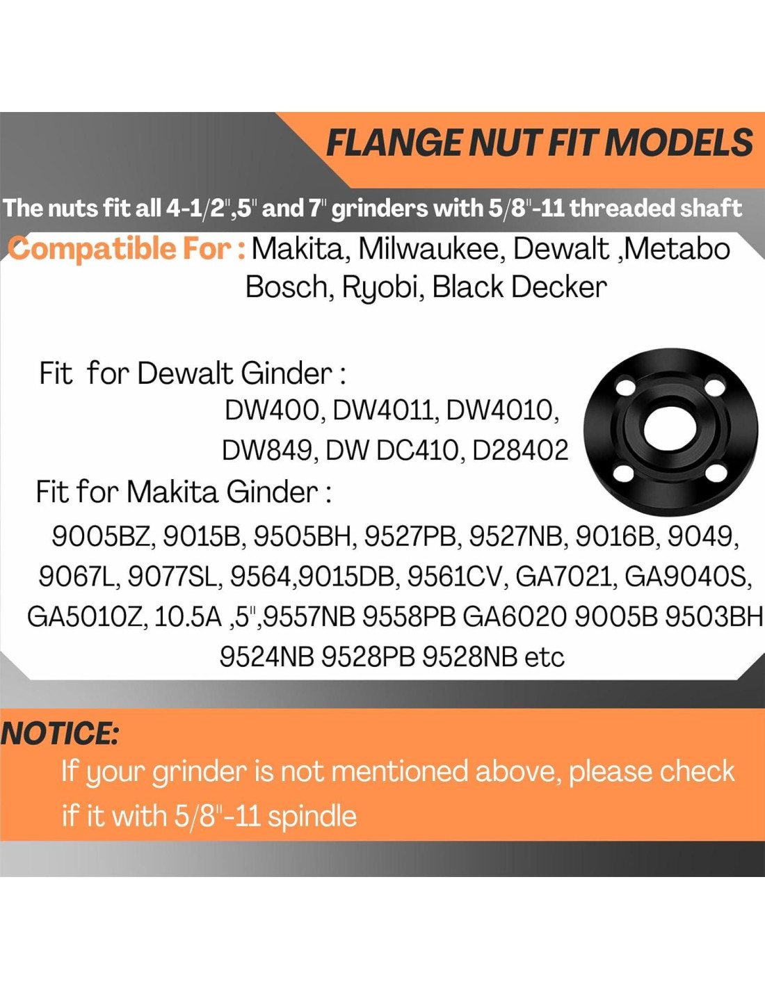 - [Instalación Rápida Sin Herramientas] : Aumente el rendimiento de su amoladora con nuestro kit de tuercas para amoladora. ¡No se necesitan herramientas adicionales! Use la llave para amoladora para: Aflojar la tuerca vieja, Alinear la nueva tuerca de brida, Apretar de forma segura.