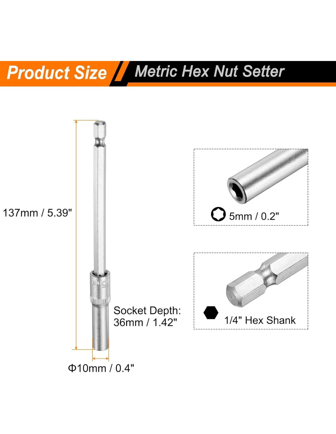 - Tamaño - Controlador de Tuercas: 5mm; Cabeza: Hexagonal; Longitud Total: 137mm; Profundidad de la Socket: 36mm; Diámetro Exterior de la Socket: 10mm; Material: Acero CR-V; Acabado: Cromo; Incluye: 2 x Controladores de Tuercas.