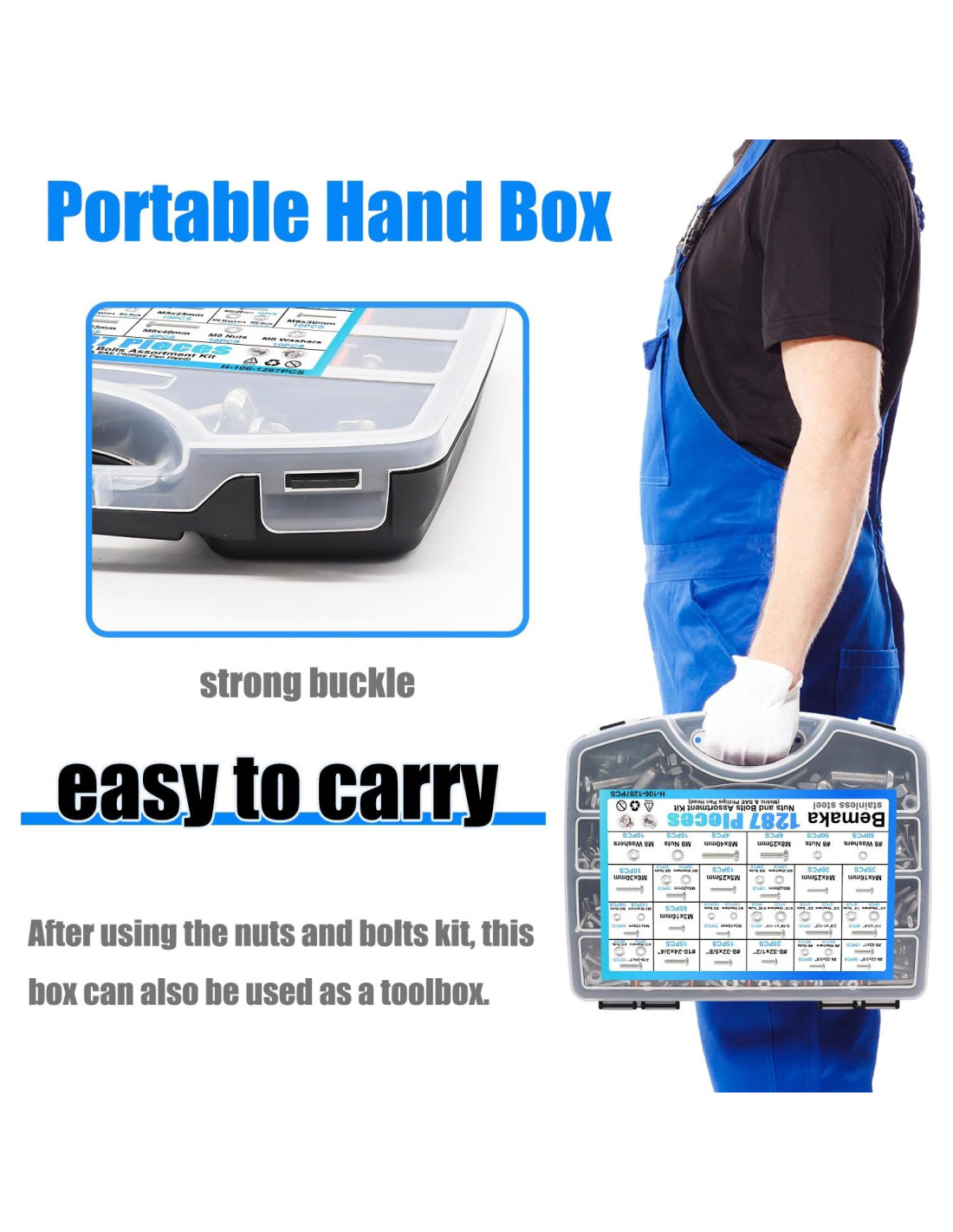 - Caja portátil: Especialmente fácil de organizar y transportar. Los tornillos de acero inoxidable están empaquetados en una caja portátil etiquetada con partición desmontable, es conveniente para que encuentres rápidamente los tornillos que necesitas, ahorrando tu tiempo en la búsqueda.