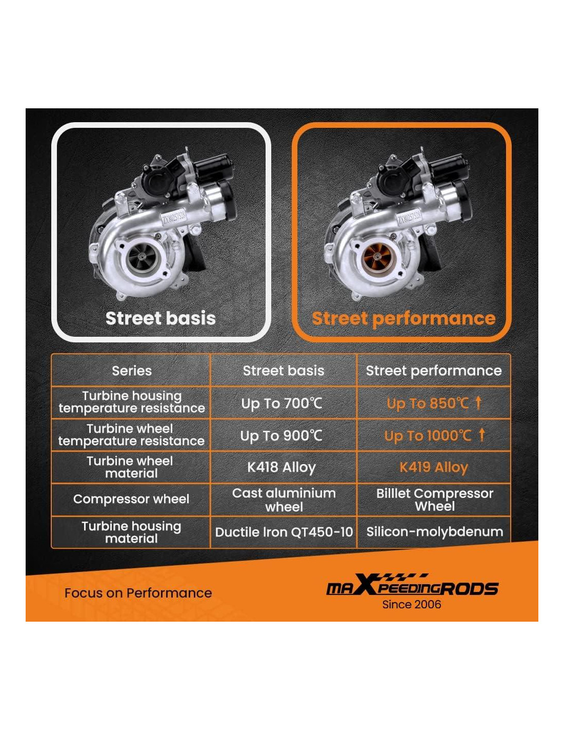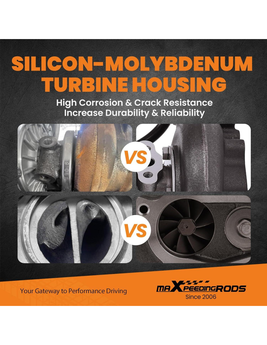 - [Mejor Carcasa de Turbina y Rueda] La carcasa de la turbina hecha de silicio-molibdeno es resistente a altas temperaturas de 850F (454C). Y la rueda de turbina de aleación mejorada tiene alta estabilidad a la oxidación y puede operar bien a 1000F (538C)