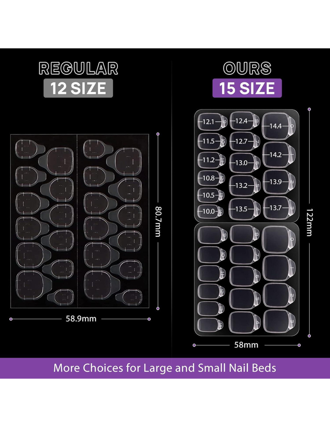 - 15 Tamaños con Números de Serie: 10 hojas de pestañas adhesivas para uñas en 15 tamaños diferentes para adaptarse a la mayoría de los dedos. 300 PCS están numerados, por lo que puedes distinguirlos rápidamente