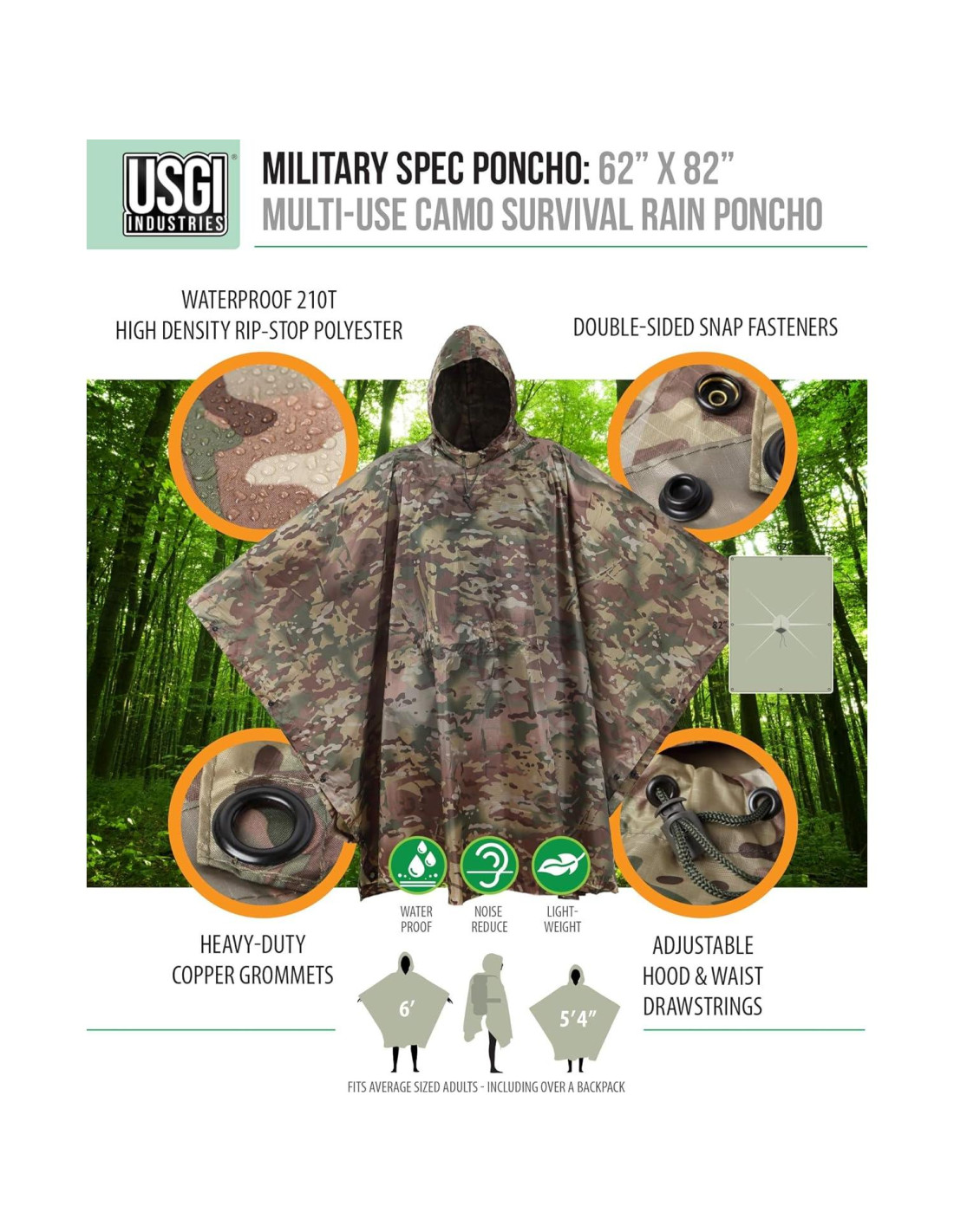 - VERSATILIDAD: Incluye un cordón en la cintura que ofrece 40.6 cm adicionales de ajustabilidad. Presenta 8 ojales de metal de alta resistencia utilizados para asegurar forros de poncho de especificaciones militares para mayor aislamiento y también facilitan conexiones de cordones para usar como un toldo, refugio de supervivencia, recolección de agua, satchel de transporte, camilla de emergencia, cubierta de hamaca, divisor de tienda, pantalla de privacidad, manta de playa, escondite de camuflaje, y más.