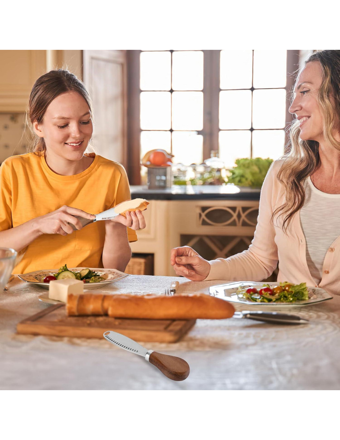 - Materiales Seleccionados, Seguro y Sin Preocupaciones El cuchillo para untar mantequilla está hecho de acero inoxidable de grado alimenticio duradero, conectado sin costuras, robusto y duradero, tratado térmicamente y diseñado a prueba de óxido. Con mango de madera, cómodo de sostener, adecuado para untar y cortar todo tipo de queso y mantequilla. Este conjunto de herramientas de cocina de diseño clásico proporciona un soporte confiable para tu cocina diaria. La exquisita artesanía hace que cada experiencia de cocina sea más cómoda.