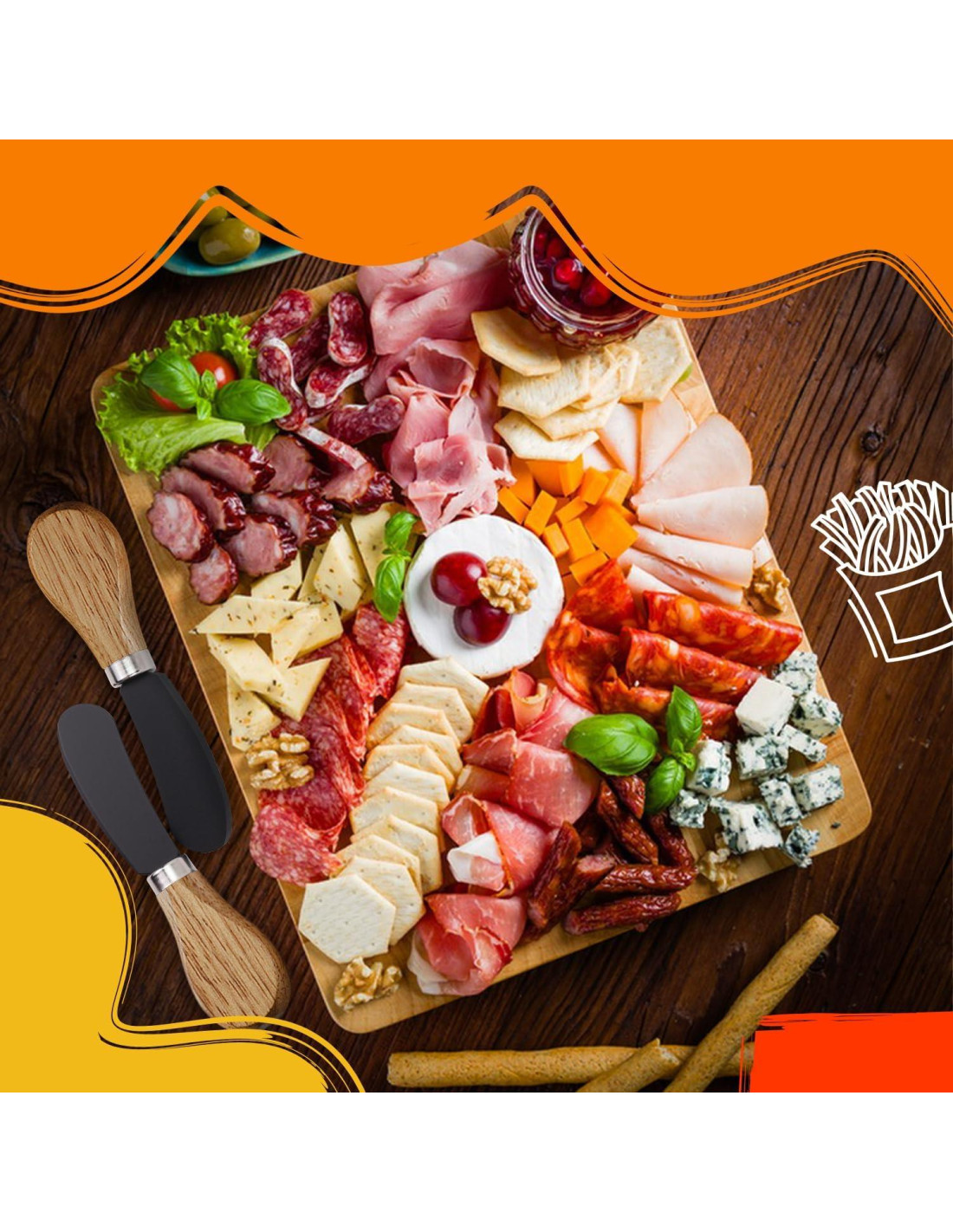 - Cuchillos espátula negros premium. Fabricados de acero inoxidable con un avanzado proceso de electroplating al vacío de PVC, estos cuchillos espátula para queso negros cuentan con un recubrimiento uniforme y duradero para una apariencia de alta gama. Equipados con mangos de madera de acacia natural, son resistentes y duraderos, naturalmente ricos en aceites, cómodos de sostener y fáciles de mantener. Una adición sofisticada a cualquier cocina, perfecta para elevar la presentación de tu tabla de charcutería.