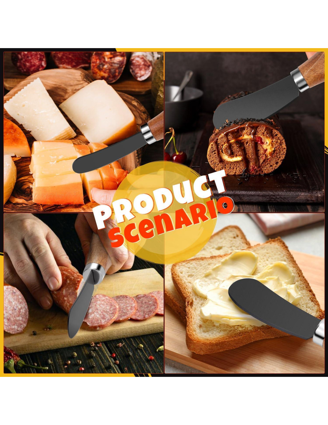 - Cuchillo espátula multipropósito. Perfecto para untar y cortar una variedad de alimentos como mantequilla, quesos suaves y duros, queso crema, mermelada, mantequilla de maní, aguacate y carnes frías. Ya sea que estés preparando el desayuno, aperitivos, tablas de charcutería, o organizando una barbacoa o picnic mientras acampas al aire libre, este versátil cuchillo espátula añade facilidad y elegancia a tu cocina y rutina de comidas al aire libre.