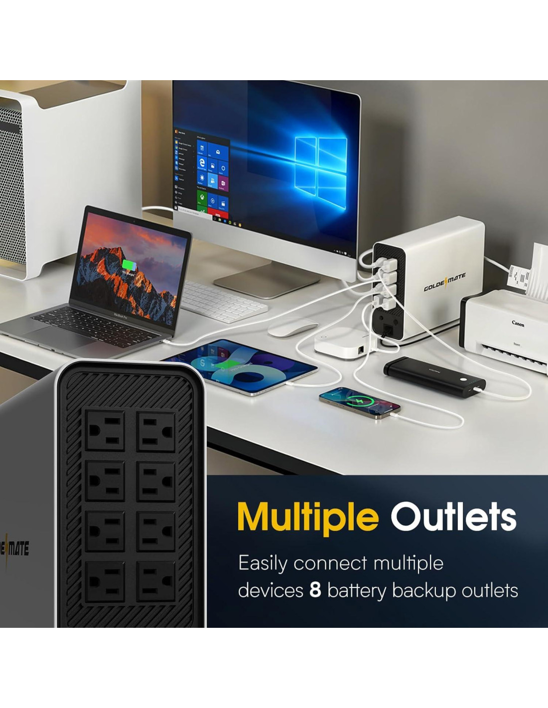 - [Múltiples Salidas y Sistema de Enfriamiento Eficiente]: Con ocho salidas NEMA 5-15P que cuentan con protección contra sobretensiones y respaldo de batería, este dispositivo plug-and-play viene con un cable de alimentación de CA. También incluye un sistema de gestión de baterías (BMS) integrado y terminales PP45 para conexiones seguras y confiables. El BMS avanzado funciona de manera eficiente con el sistema de enfriamiento. El ventilador de enfriamiento recientemente actualizado opera a un nivel de ruido por debajo de 50 dB. Nota: El ventilador de enfriamiento de alta potencia se activará cuando el BMS detecte un uso intensivo de la batería.