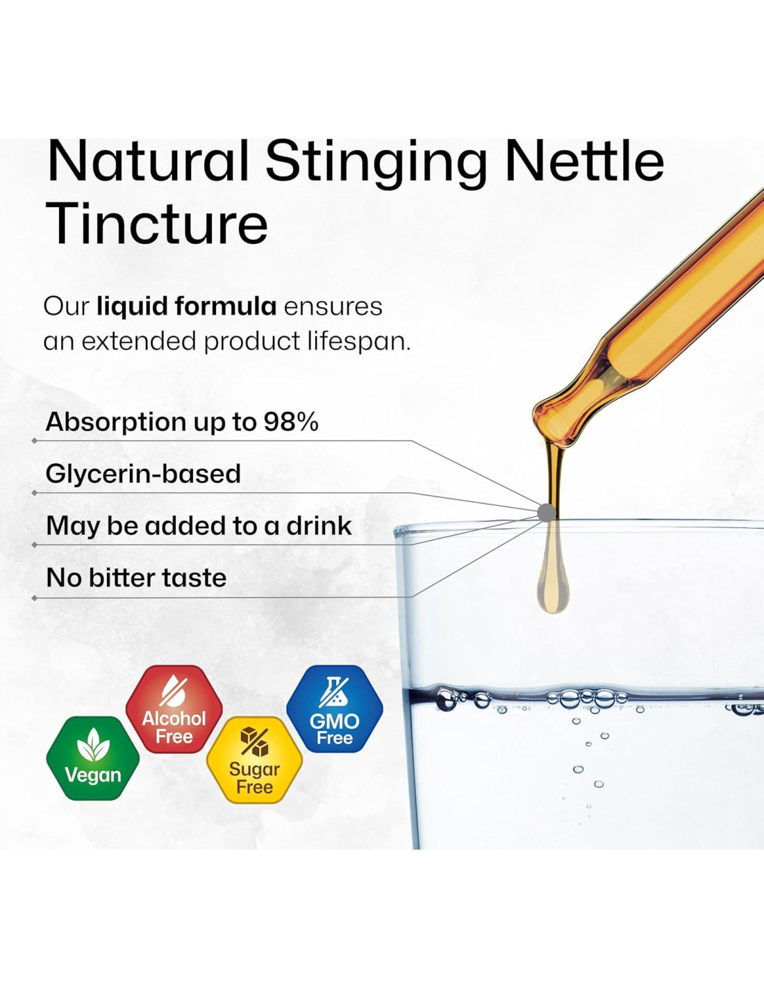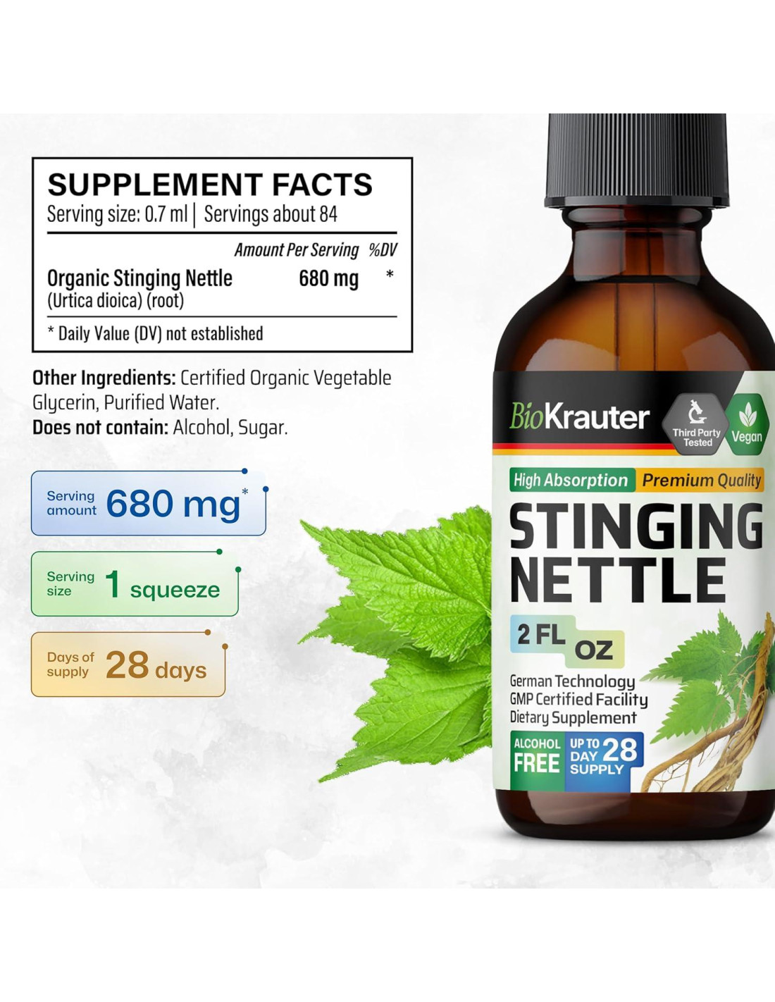 - Vegano y Sin Alcohol: Nuestra fórmula de tintura de raíz de ortiga es vegana, no OGM y libre de alcohol, colores artificiales y sabores, diseñada para alinearse con una amplia gama de estilos de vida.
