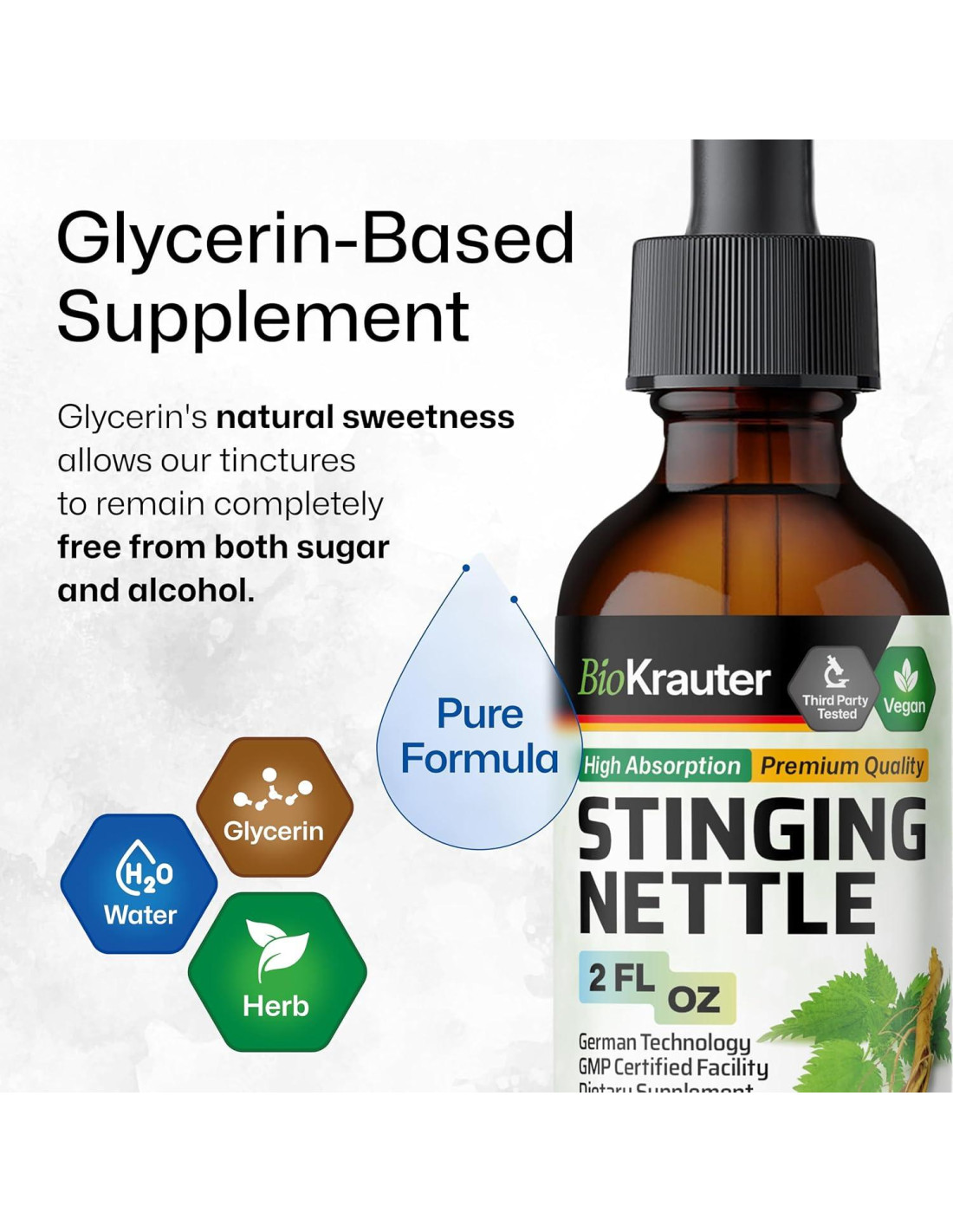 - Tecnología Alemana: Utilizamos tecnología alemana para elaborar un suplemento líquido de ortiga que apoya naturalmente su sistema urinario. Hecho solo con tres ingredientes simples: agua, glicerina y ortigas, esta fórmula proporciona hasta un 98% de absorción.