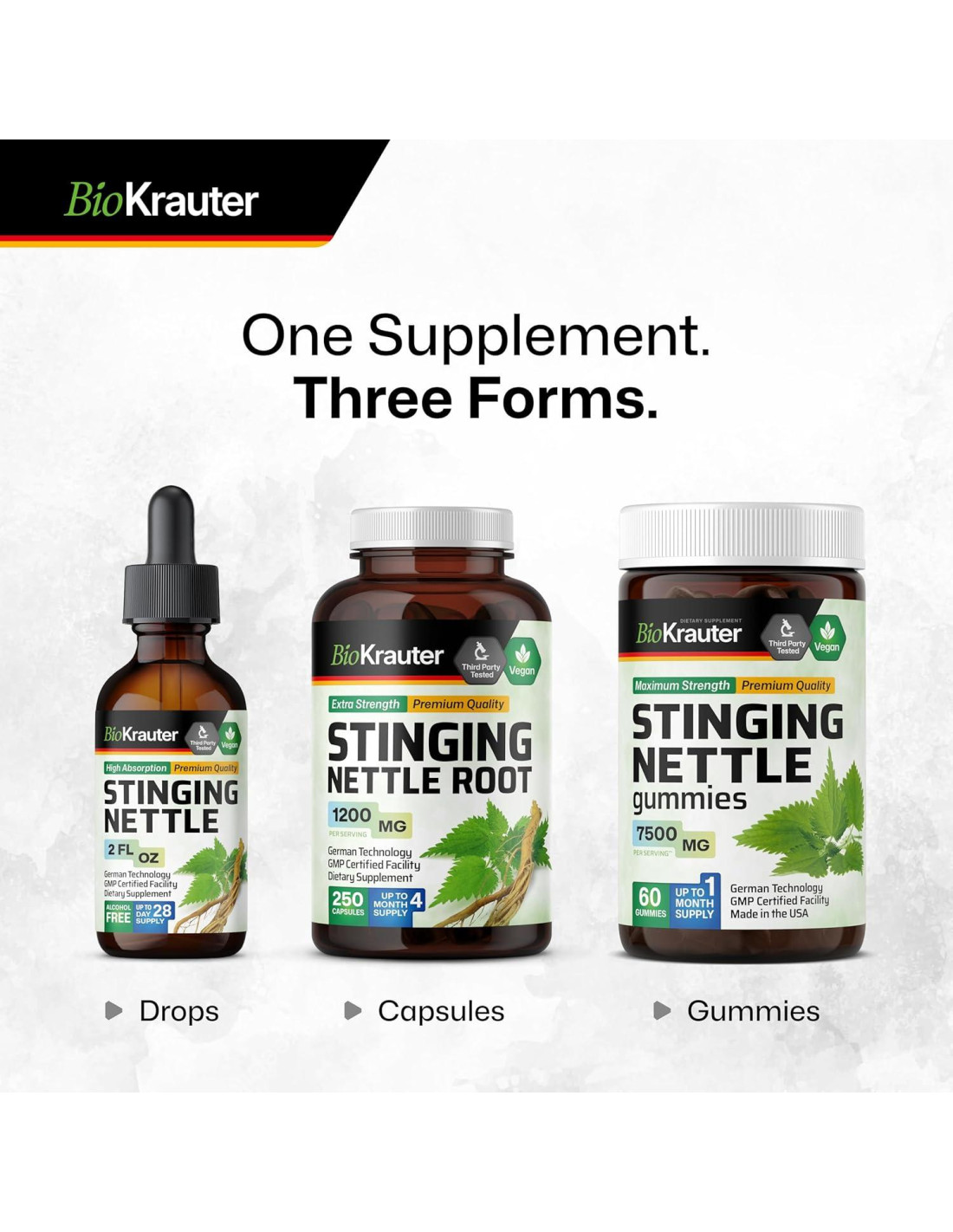 - Tintura de Ortiga para la Salud Urinaria: Gotas líquidas de ortiga BioKrauter, hechas de Urtica Dioica (comúnmente conocida como ortiga), apoyan la salud urinaria.