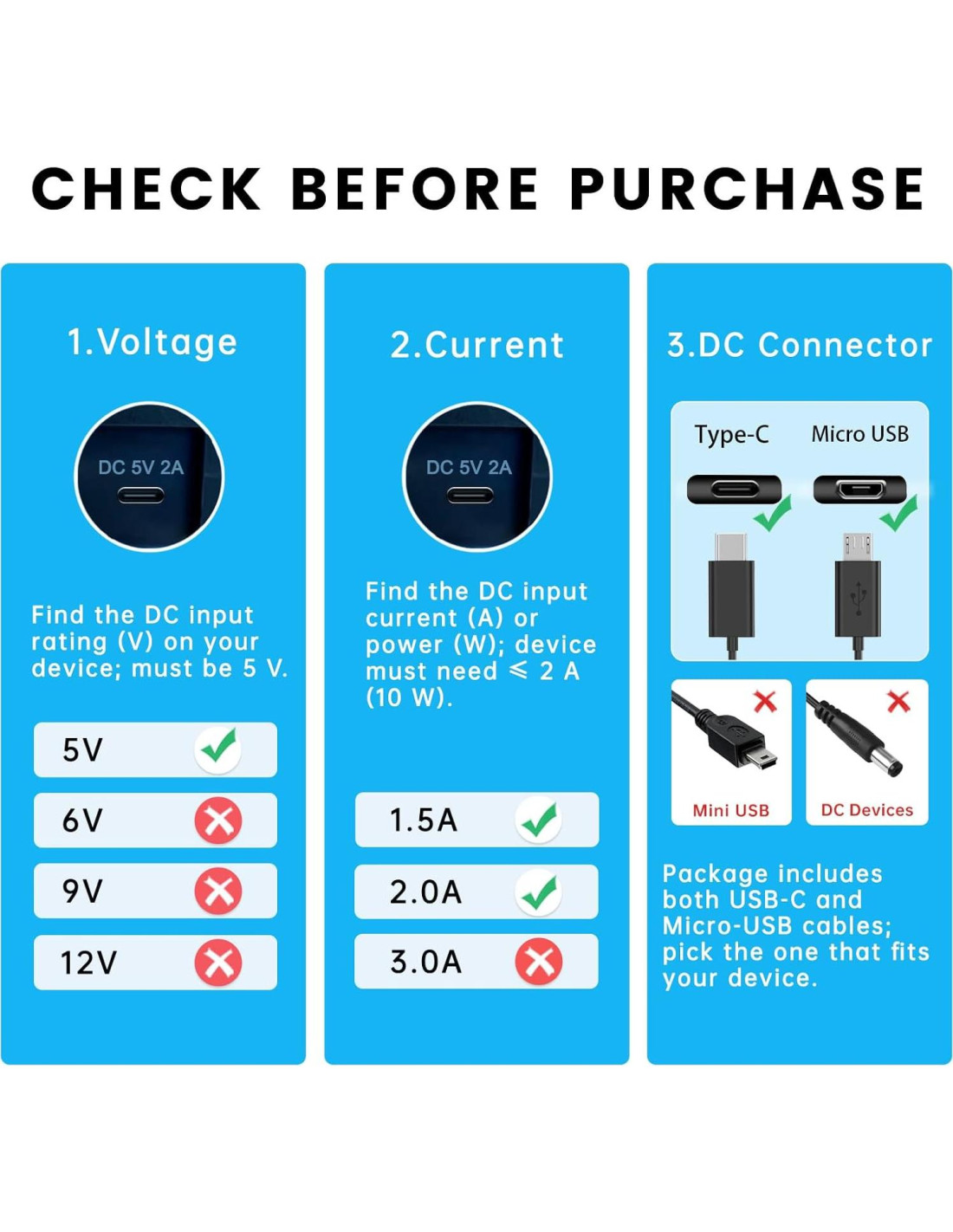 Encuentra la clasificación de entrada de CC (V) en tu dispositivo; debe ser 5 V.