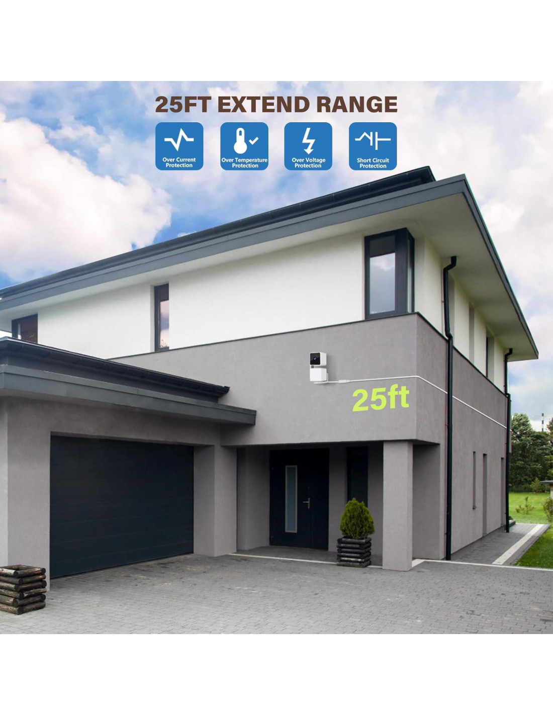 - [Cable plano de 25 pies (7.5 m)] Presenta un cable plano de 2 mm de grosor, que puede caber fácilmente a través de espacios reducidos como puertas y ventanas, previene enredos y ahorra espacio. Cable lo suficientemente largo de 25 pies que permite que tu cámara de seguridad inalámbrica esté conectada a una distancia mucho mayor, manteniendo un suministro de energía de 24 horas.