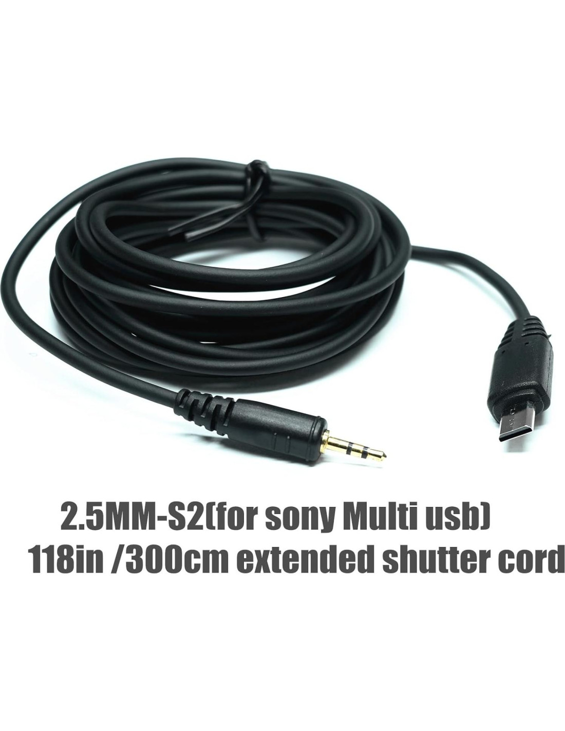 Cable de extensión S2 para obturador para Sony Multi USB 1) Modelo A: 2.5mm-S2(Multi USB)300cm/118pulg 2) Tipo B: 3.5mm-S2(Multi USB)300cm/118pulg 3) Equipos aplicables: Aplicable a todos los controles remotos de obturador inalámbrico de cámara con jack de obturador en el mercado, control remoto de cable de obturador. Debido a diferentes marcas, hay básicamente dos tipos de jacks de 2.5mm y 3.5mm, y los usuarios deben medir el tamaño del jack en su propio control remoto antes de comprar el cable de conexión. (El conector de 3.5mm y el conector de auriculares de teléfono/puerto de micrófono de computadora son del mismo tamaño) 4) Función: enfocar, tomar fotos 5) Longitud del cable: 300cm/118 pulgadas, diámetro del cable 3.0mm cable negro de PVC. 6) S2(Multi USB) Cámara aplicable: para Sony--A1,A9,A9II,A7,A7M2,A7M3,A7M4,A7S,A7SII,A7S3,A7R,A7R2,A7R3,A7R4,A7R5,A5000,A5100,A5300,A6000,A6100,A6300,A6400,A6500,A6600,NEX-3,RX0,RX0II....